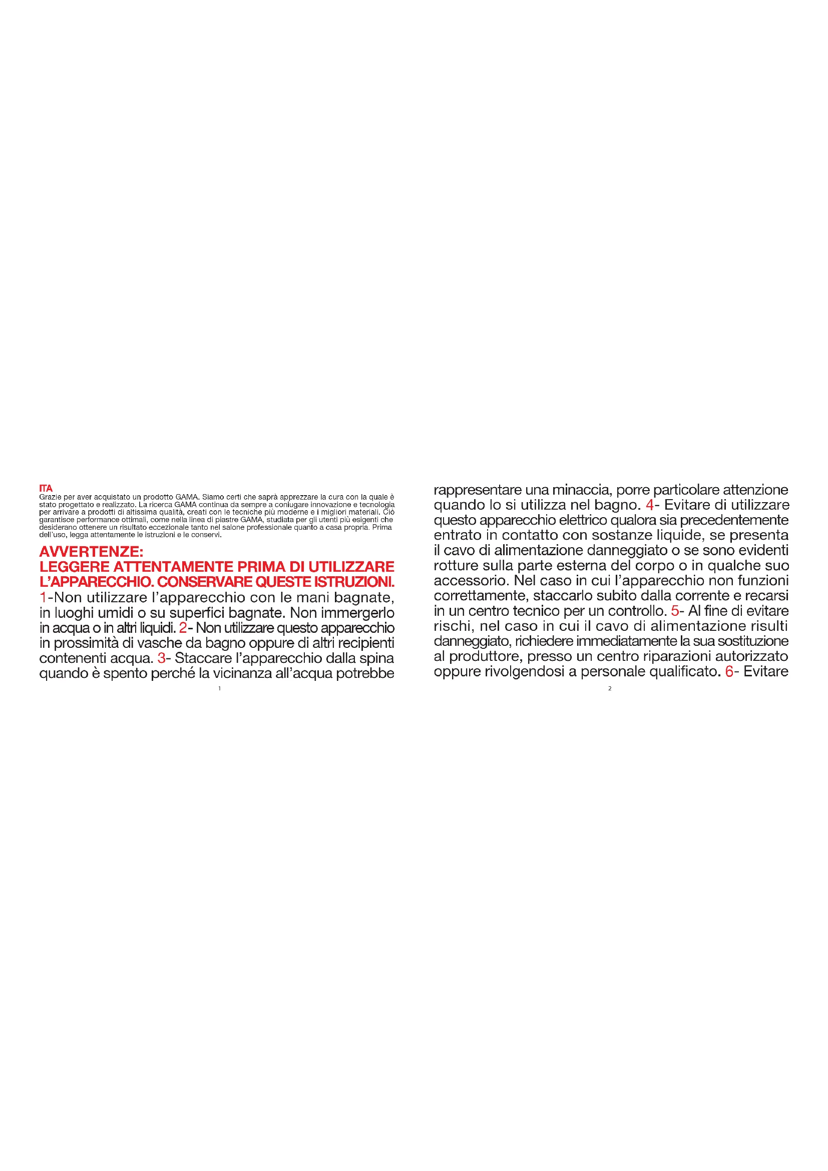 ITA Grazie per aver acquistato un prodotto GAMA. Siamo certi che saprà apprezzare la cura con la quale è stato progettato e realizzato. La ricerca GAMA continua da sempre a coniugare innovazione e tecnologia per arrivare a prodotti di altissima qualità, creati con le tecniche più moderne e i migliori materiali. Ciò garantisce performance ottimali, come nella linea di piastre GAMA, studiata per gli utenti più esigenti che desiderano ottenere un risultato eccezionale tanto nel salone professionale quanto a casa propria. Prima dell’uso, legga attentamente le istruzioni e le conservi. AVVERTENZE: