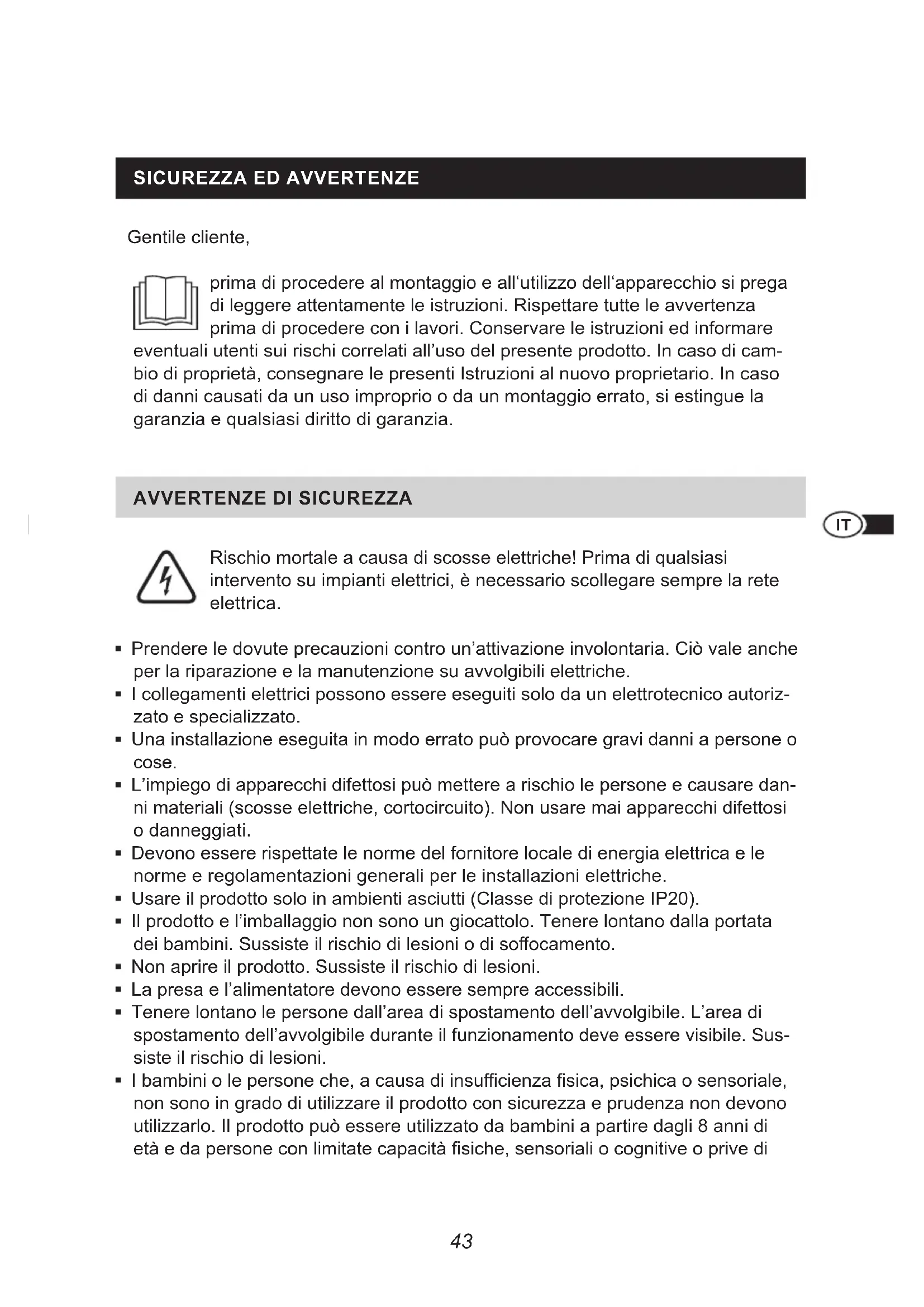Gentile cliente, prima di procedere al montaggio e all‘utilizzo dell‘apparecchio si prega di leggere attentamente le istruzioni. Rispettare tutte le avvertenza prima di procedere con i lavori. Conservare le istruzioni ed informare eventuali utenti sui rischi correlati all’uso del presente prodotto. In caso di cam- bio di proprietà, consegnare le presenti Istruzioni al nuovo proprietario. In caso di danni causati da un uso improprio o da un montaggio errato, si estingue la garanzia e qualsiasi diritto di garanzia