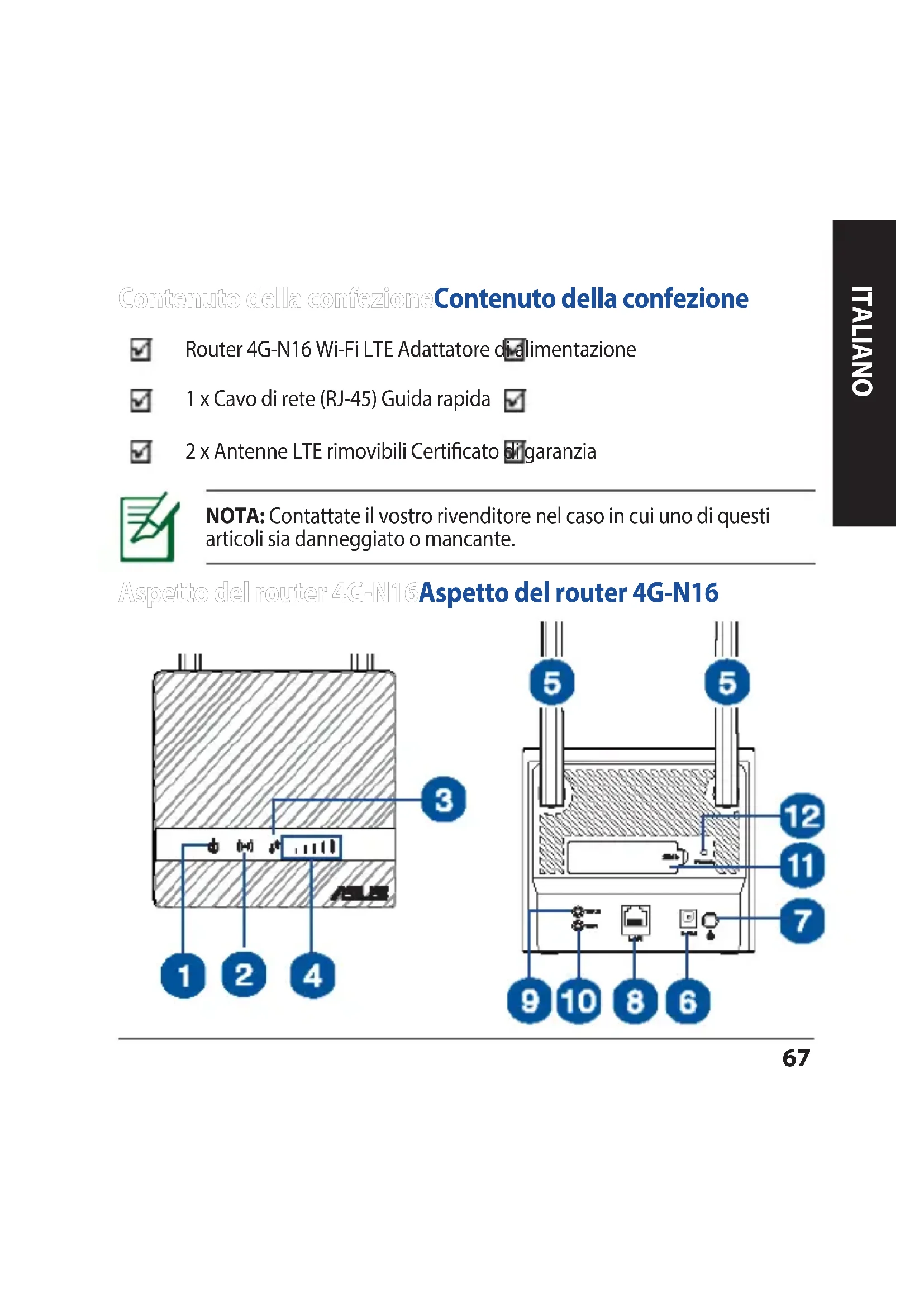 Üzemi páratartalom ≤ 90% Tárolás ≤ 95%67 ITALIANO NOTA: Contattate il vostro rivenditore nel caso in cui uno di questi articoli sia danneggiato o mancante. Contenuto della confezioneContenuto della confezione Router 4G-N16 Wi-Fi LTE Adattatore di alimentazione 1 x Cavo di rete (RJ-45) Guida rapida 2 x Antenne LTE rimovibili Certicato di garanzia Aspetto del router 4G-N16Aspetto del router 4G-N16 Italiano68 ITALIANO