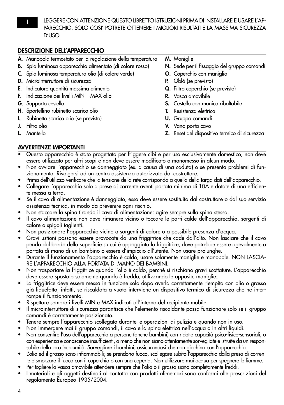 • Pour retirer la cuve amovible, toujours attendre que l'huile ou la graisse aient refroidi. • Les matériaux et les objets destinés à entrer en contact avec les denrées alimentaires sont conformes aux prescriptions du règlement européen 1935/2004. • Faites attention à la vapeur et aux éventuelles éclaboussures d’huile provoquées par l’ouverture du couvercle. • L’appareil ne doit pas fonctionner au moyen d’une minuterie externe ou d’un système séparé de télécommande. • Conserver ces instructions.