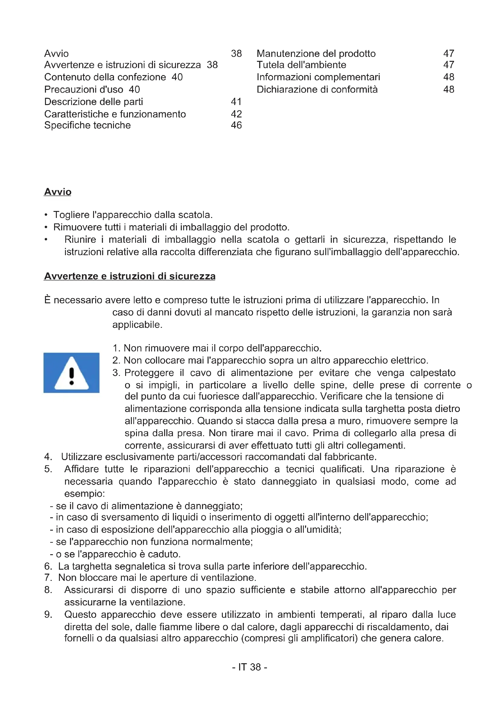diretta del sole, dalle amme libere o dal calore, dagli apparecchi di riscaldamento, dai fornelli o da qualsiasi altro apparecchio (compresi gli amplicatori) che genera calore. Avvio 38 Avvertenze e iruzioni di sicurezza 38 Contenuto della confezione 40 Precauzioni d'uso 40 Descrizione delle parti 41 Caratteriiche e funzionamento 42 Speciche tecniche 46 Manutenzione del prodotto 47 Tutela dell'ambiente 47 Informazioni complementari 48 Dichiarazione di conformità 48- IT 39 - Non inallarlo in prossimità di fonti di calore.