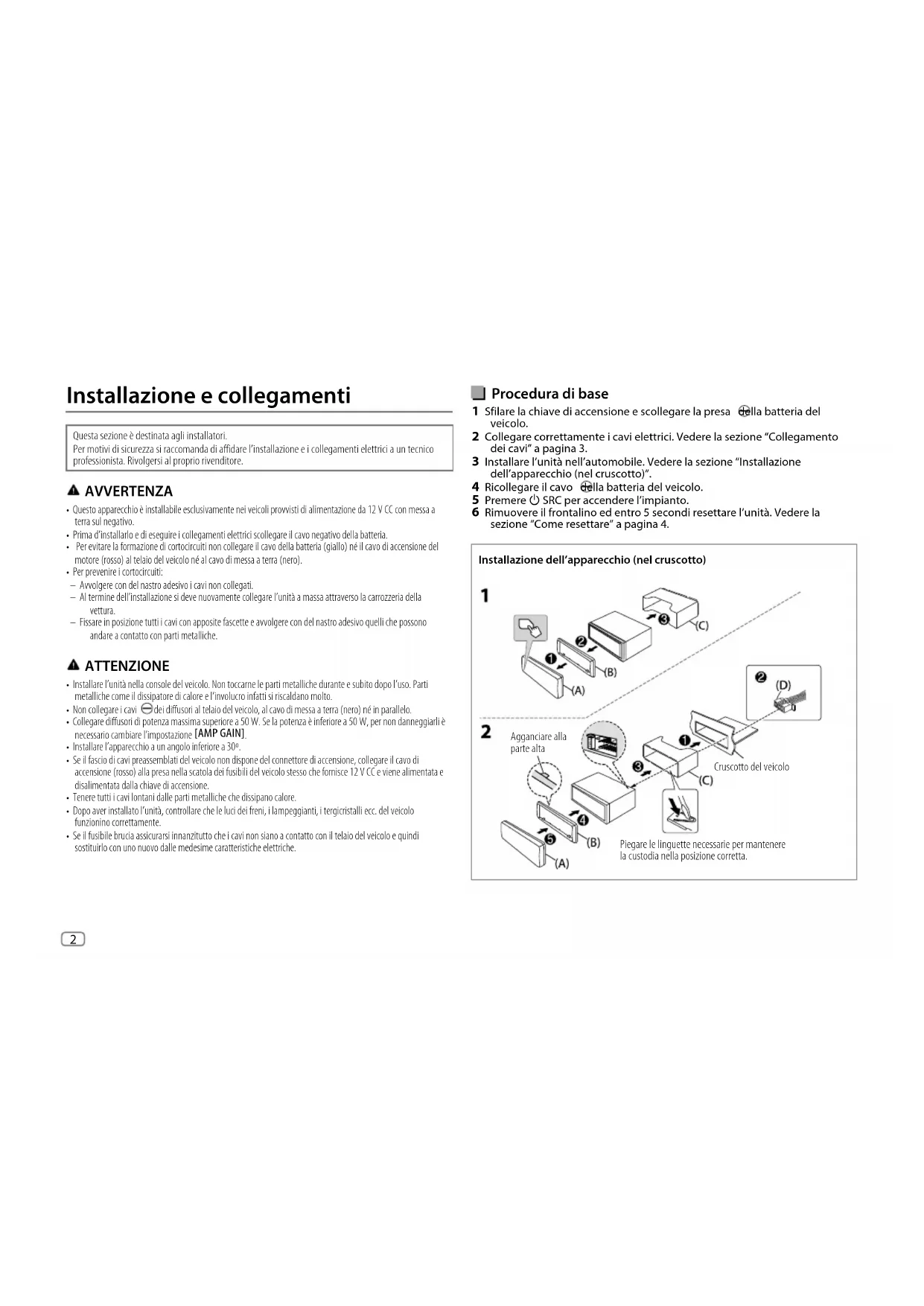 KD-X282DBT_E_B5K-0869-00_FR.indd 8KD-X282DBT_E_B5K-0869-00_FR.indd 8 2022/04/08 13:09:012022/04/08 13:09:01KD-X282DBT_E_B5K-0869-00_FR.indd 9KD-X282DBT_E_B5K-0869-00_FR.indd 9 2022/04/08 13:09:022022/04/08 13:09:022 Data Size: B6L (182 mm x 128 mm)Book Size: B6L (182 mm x 128 mm) Procedura di base 1 Sfilare la chiave di accensione e scollegare la presa della batteria del veicolo. 2 Collegare correttamente i cavi elettrici. Vedere la sezione “Collegamento dei cavi” a pagina3. 3 Installare l’unità nell’automobile. Vedere la sezione “Installazione dell’apparecchio (nel cruscotto)”. 4 Ricollegare il cavo della batteria del veicolo. 5 Premere B SRC per accendere l’impianto. 6 Rimuovere il frontalino ed entro 5 secondi resettare l’unità. Vedere la sezione “Come resettare” a pagina4. Installazione dell’apparecchio (nel cruscotto) Installazione e collegamenti Questa sezione è destinata agli installatori. Per motivi di sicurezza si raccomanda di affidare l’installazione e i collegamenti elettrici a un tecnico professionista. Rivolgersi al proprio rivenditore. AVVERTENZA
