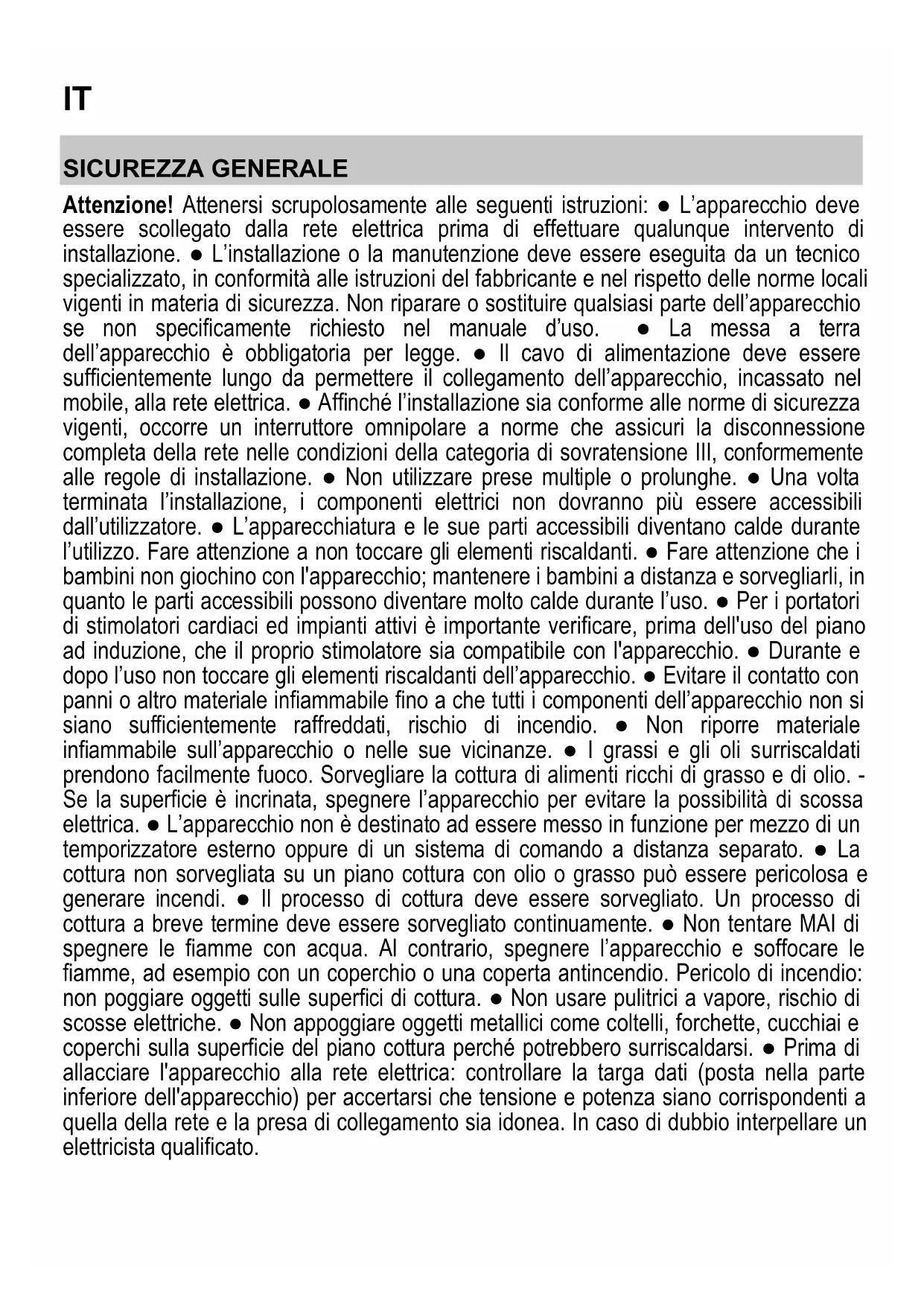 SICUREZZA GENERALE Attenzione! Attenersi scrupolosamente alle seguenti istruzioni: ● L’apparecchio deve essere scollegato dalla rete elettrica prima di effettuare qualunque intervento di installazione. ● L’installazione o la manutenzione deve essere eseguita da un tecnico specializzato, in conformità alle istruzioni del fabbricante e nel rispetto delle norme locali vigenti in materia di sicurezza. Non riparare o sostituire qualsiasi parte dell’apparecchio se non specificamente richiesto nel manuale d’uso. ● La messa a terra dell’apparecchio è obbligatoria per legge. ● Il cavo di alimentazione deve essere sufficientemente lungo da permettere il collegamento dell’apparecchio, incassato nel mobile, alla rete elettrica. ● Affinché l’installazione sia conforme alle norme di sicurezza vigenti, occorre un interruttore omnipolare a norme che assicuri la disconnessione completa della rete nelle condizioni della categoria di sovratensione III, conformemente alle regole di installazione. ● Non utilizzare prese multiple o prolunghe. ● Una volta terminata l’installazione, i componenti elettrici non dovranno più essere accessibili dall’utilizzatore. ● L’apparecchiatura e le sue parti accessibili diventano calde durante l’utilizzo. Fare attenzione a non toccare gli elementi riscaldanti. ● Fare attenzione che i bambini non giochino con l'apparecchio; mantenere i bambini a distanza e sorvegliarli, in quanto le parti accessibili possono diventare molto calde durante l’uso. ● Per i portatori di stimolatori cardiaci ed impianti attivi è importante verificare, prima dell'uso del piano ad induzione, che il proprio stimolatore sia compatibile con l'apparecchio. ● Durante e dopo l’uso non toccare gli elementi riscaldanti dell’apparecchio. ● Evitare il contatto con panni o altro materiale infiammabile fino a che tutti i componenti dell’apparecchio non si siano sufficientemente raffreddati, rischio di incendio. ● Non riporre materiale infiammabile sull’apparecchio o nelle sue vicinanze. ● I grassi e gli oli surriscaldati prendono facilmente fuoco. Sorvegliare la cottura di alimenti ricchi di grasso e di olio. - Se la superficie è incrinata, spegnere l’apparecchio per evitare la possibilità di scossa elettrica. ● L’apparecchio non è destinato ad essere messo in funzione per mezzo di un temporizzatore esterno oppure di un sistema di comando a distanza separato. ● La cottura non sorvegliata su un piano cottura con olio o grasso può essere pericolosa e generare incendi. ● Il processo di cottura deve essere sorvegliato. Un processo di cottura a breve termine deve essere sorvegliato continuamente. ● Non tentare MAI di spegnere le fiamme con acqua. Al contrario, spegnere l’apparecchio e soffocare le fiamme, ad esempio con un coperchio o una coperta antincendio. Pericolo di incendio: non poggiare oggetti sulle superfici di cottura. ● Non usare pulitrici a vapore, rischio di scosse elettriche. ● Non appoggiare oggetti metallici come coltelli, forchette, cucchiai e coperchi sulla superficie del piano cottura perché potrebbero surriscaldarsi. ● Prima di allacciare l'apparecchio alla rete elettrica: controllare la targa dati (posta nella parte inferiore dell'apparecchio) per accertarsi che tensione e potenza siano corrispondenti a quella della rete e la presa di collegamento sia idonea. In caso di dubbio interpellare un elettricista qualificato.27 Importante: ● Dopo l'uso, spegnere il piano cottura tramite il suo dispositivo di comando e non fare affidamento sul rivelatore di pentole. ● Evitare le fuoriuscite di liquido, pertanto per bollire o riscaldare liquidi, ridurre l’alimentazione di calore. ● Non lasciare gli elementi riscaldanti accesi con pentole e padelle vuote oppure senza recipienti. ● Una volta terminato di cucinare, spegnere la relativa zona di cottura. ● Per la cottura non utilizzate mai dei fogli di carta d'alluminio, e non posate mai direttamente prodotti imballati con alluminio. L'alluminio fonderebbe e danneggerebbe irrimediabilmente il vostro apparecchio. ● Non riscaldare mai una scatoletta o un barattolo di latta contenente alimenti senza prima averlo aperto: potrebbe esplodere! Questa avvertenza si applica a tutti gli altri tipi di piani cottura. ● L'utilizzo di una potenza elevata come la funzione Booster non è adatta per il riscaldamento di alcuni liquidi come ad esempio l'olio per friggere. L'eccessivo calore potrebbe essere pericoloso. In questi casi si consiglia l'utilizzo di una potenza meno elevata. ● l recipienti devono essere posti direttamente sul piano cottura e devono essere centrati. In nessun caso inserire altri oggetti tra la pentola e il piano cottura. ● In situazione di elevate temperature l'apparecchio diminuisce automaticamente il livello di potenza delle zone di cottura. ● Prima di qualsiasi operazione di pulizia o manutenzione, disinserire l'apparecchio dalla rete elettrica togliendo la spina o staccando l’interruttore generale dell’abitazione. ● Per tutte le operazioni di installazione e manutenzione utilizzare guanti da lavoro. ● L’apparecchio può essere utilizzato da bambini di età non inferiore a 8 anni e da persone con ridotte capacità fisiche, sensoriali o mentali, o prive di esperienza o della necessaria conoscenza, purché sotto sorveglianza oppure dopo che le stesse abbiano ricevuto istruzioni relative all’uso sicuro dell’apparecchio e alla comprensione dei pericoli ad esso inerenti. ● I bambini devono essere controllati affinché non giochino con l’apparecchio. ● La pulizia e la manutenzione non deve essere effettuata da bambini senza sorveglianza. ● Il locale deve disporre di sufficiente ventilazione, quando l'apparecchio viene utilizzato contemporaneamente ad altri apparecchi a combustione di gas o altri combustibili. ● L'apparecchio va frequentemente pulito sia internamente che esternamente (ALMENO UNA VOLTA AL MESE), rispettare com