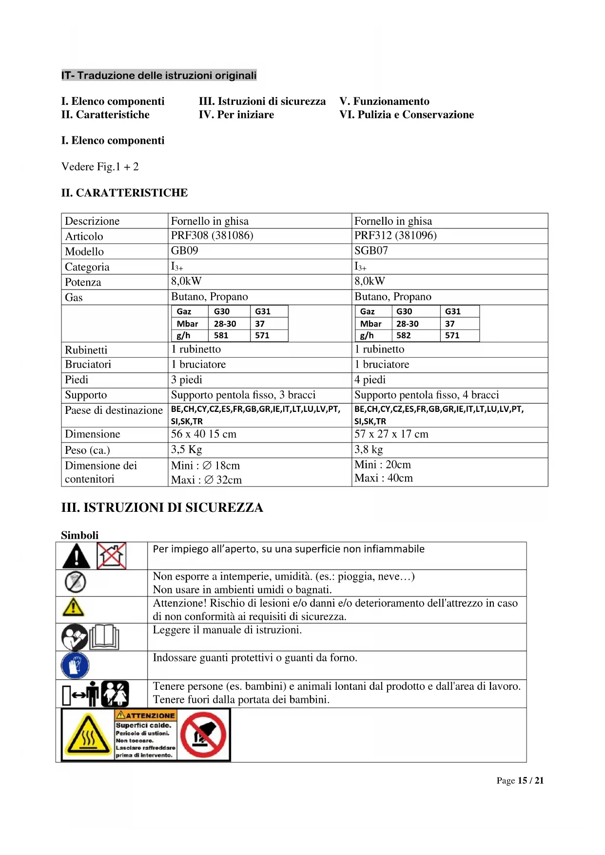 utilizza gas butano (28-30Mbar) o gas propano (37Mbar). - Il prodotto è destinato per un uso domestico all’aperto. - Il prodotto è destinato per cucinare o riscaldare alimenti. - Questo prodotto non deve essere utilizzato per fare altre cose all'infuori dell'uso descrive in questo manuale. - Non montare accessori non raccomandati dal produttore. - Questo prodotto non è inteso per uso artigianale, commerciale, professionale e / o industriale. 5.2- Installazione Nota: l'installazione e la manutenzione del dispositivo devono essere eseguite in conformità con le normative nazionali e / o locali e lo stato attuale della tecnica. Installare l'unità su una superficie piana, orizzontale e sufficientemente resistente (in grado di sostenere il peso del dispositivo, del contenitore e del contenuto). La superficie di installazione deve essere fatta di materiali non infiammabili / ritardanti di fiamma o resistenti agli aumenti di temperatura elevata, che possono essere >70°C (es. lastra di marmo, pavimento in cemento ...) Tenere il dispositivo a una distanza di 20 cm da qualsiasi parete o muro o oggetto infiammabile e 1 m da un soffitto. Non spostare il dispositivo durante l'uso! 5.3- Utilizzo Queste fornelli includono 1 bruciatore (3). Il controllo del bruciatore (accensione ed estinzione) è attraverso il rubinett0 (1). Effettuare il collegamento alla fonte di alimentazione di gas. a) Prima messa in funzione Durante la prima messa in servizio, riscaldare il fornello (accendere il bruciatore) all'aperto per evacuare i fumi residui di olio utilizzati nella fabbricazione di parti metalliche. Un leggero odore può emanare per alcuni momenti. Spegnere il bruciatore, lasciare raffreddare e pulire il dispositivo prima del primo utilizzo b) Uso Metti gli alimenti o liquido in un contenitore adatto. Accendi il bruciatore. Posizionare il contenitore al centro della stufa. Girare la valvola (1) per regolare la fiamma. Una volta terminata la cottura, spegnere il rubinetto (1) e spegnere l'alimentazione del gas. Lasciare raffreddare il bruciatore ed il fornello, quindi pulire e mantenere l'apparecchio. Nota: - Utilizzare contenitore per cottura al gas. - Utilizzare contenitore preferibilmente di forma rotonda, con fondo piatto e dimensioni (vedere tabbella). - Non utilizzare mai pentole con formati non adatti ai supporti del fornello (ad es. contenitori con fondo convesso, fondo concavo ...) o con diametro superiore alle caratteristiche indicate nella tabbella. - L'uso di pentole non idonee può causare l'instabilità delle pentole o del fornello. Questi potrebbero cadere e causare incendi, ustioni, gravi lesioni o la morte. - Quando si maneggiano componenti particolarmente caldi, si consiglia di utilizzare i guanti protettivi. - Non raggruppare mai una o più fornello. - Non usare mai il fornello per riscaldare o asciugare recipienti di cottura, stanze ... rischio di incendio!Page 20 / 21