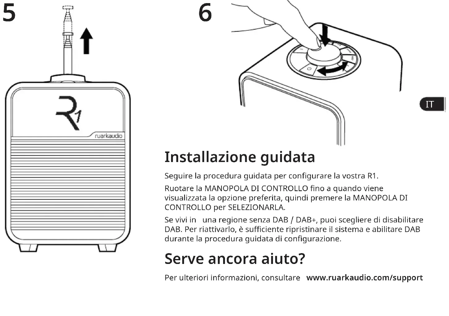 Regolazione del volume Raccomandiamo di regolare il volume sul proprio dispositivo Bluetooth in modo che il volume di riproduzione sulla R1 sia indicativamente uguale a quello di altre sorgenti. Consigliamo quindi di utilizzare il controllo del volume sulla R1 per regolare il volume di riproduzione generale. Collegare un dispositivo diverso MENU > Collega disp. Selezionare Nuovo o ruotare la manopola di controllo per selezionare uno dei dispositivi esistenti nell’elenco di accoppiamento. Accoppiamento di altri dispositivi È possibile accoppiare no a 8 dispositivi sebbene si potrà riprodurre audio solo da un dispositivo alla volta. Cancellazione dell’elenco dei dispositivi accoppiati MENU > Dimentica disp. In caso di problemi con la connessione del dispositivo Bluetooth raccomandiamo di eliminare tutte le informazioni relative all’accoppiamento. Sarà inoltre necessario cancellare Ruark R1 dall’elenco dei dispositivi accoppiati del proprio dispositivo Bluetooth prima di riaccoppiarlo alla R1. Per maggiori informazioni consultare la documentazione relativa al proprio dispositivo Bluetooth. Chi avesse bisogno di aiuto per utilizzare il Bluetooth può visitare il sito www.ruarkaudio.com/support Nota: non è possibile utilizzare la funzione Bluetooth della R1 per collegare cue BluetoothRadio DAB La prima volta che si utilizza DAB sulla R1, o se l'elenco delle stazioni è vuoto, il dispositivo eseguirà automaticamente una scansione completa alla ricerca di stazioni DAB disponibili. Cambio di stazione Premere o per mostrare l’elenco delle stazioni. Premerlo per visualizzare la stazione successiva o precedente. Per sintonizzarsi su una stazione, selezionarla premendo la MANOPOLA DI CONTROLLO. Una volta visualizzato l’elenco delle stazioni, è anche possibile scorrere l’elenco ruotando la MANOPOLA DI CONTROLLO e selezionare una stazione premendo la manopola. È inoltre possibile visualizzare l’elenco delle stazioni selezionando MENU> Elenco stazioni. Testo radio DAB (DLS) MENU > Info Seleziona le informazioni sul programma da visualizzare. Salvataggio preimpostazione È possibile memorizzare no a 8 stazioni DAB nell’elenco delle preimpostazioni. Ved. la sezione “Funzioni comuni”. Richiamo di una preimpostazione Ved. la sezione “Funzioni comuni”. Scansione delle stazioni MENU > Ricerca stazioni Raccomandiamo di aggiornare periodicamente l’elenco delle stazioni con una scansione delle stazioni. Se l’elenco delle stazioni è vuoto, la radio eseguirà automaticamente una scansione delle stazioni non appena si passa a DAB. Per una ricezione ottimale allungare al massimo l’antenna e regolarne la posizione.EN