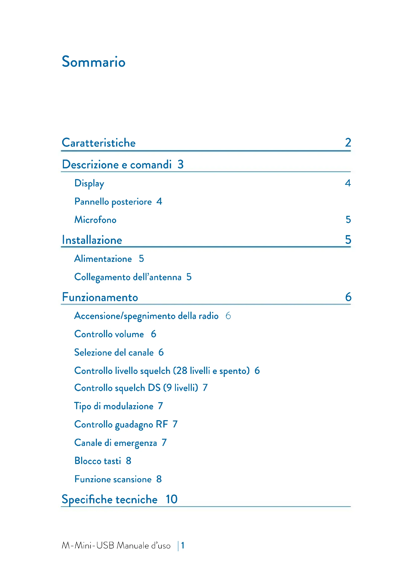 M-Mini USBFRANÇAIS ESPAÑOL DEUTSCH ENGLISH ITALIANO POLSKI ROMANAM-Mini-USB Manuale d’uso | 1 Sommario Caratteristiche 2 Descrizione e comandi 3 Display 4 Pannello posteriore 4 Microfono 5 Installazione 5 Alimentazione 5 Collegamento dell’antenna 5 Funzionamento 6 Accensione/spegnimento della radio 6 Controllo volume 6 Selezione del canale 6 Controllo livello squelch (28 livelli e spento) 6 Controllo squelch DS (9 livelli) 7 Tipo di modulazione 7 Controllo guadagno RF 7 Canale di emergenza 7 Blocco tasti 8 Funzione scansione 8 Specifiche tecniche 102 | M-Mini-USB Manuale d’uso Caratteristiche