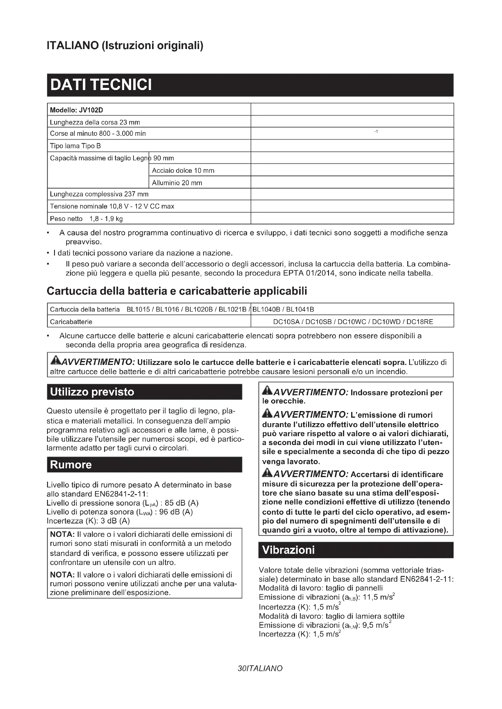 - Alcunecartuccedellebatterieealcunicaricabatterieelencatisoprapotrebberononesseredisponibilia secondadellapropriaareageogracadiresidenza. AVVERTIMENTO: Utilizzare solo le cartucce delle batterie e i caricabatterie elencati sopra. L’utilizzo di altrecartuccedellebatterieedialtricaricabatteriepotrebbecausarelesionipersonalie/ounincendio. Utilizzo previsto Questoutensileèprogettatoperiltagliodilegno,pla- stica e materiali metallici. In conseguenza dell’ampio programmarelativoagliaccessorieallelame,èpossi- bileutilizzarel’utensilepernumerosiscopi,edèpartico- larmente adatto per tagli curvi o circolari. Rumore LivellotipicodirumorepesatoAdeterminatoinbase allostandardEN62841-2-11: Livello di pressione sonora (L