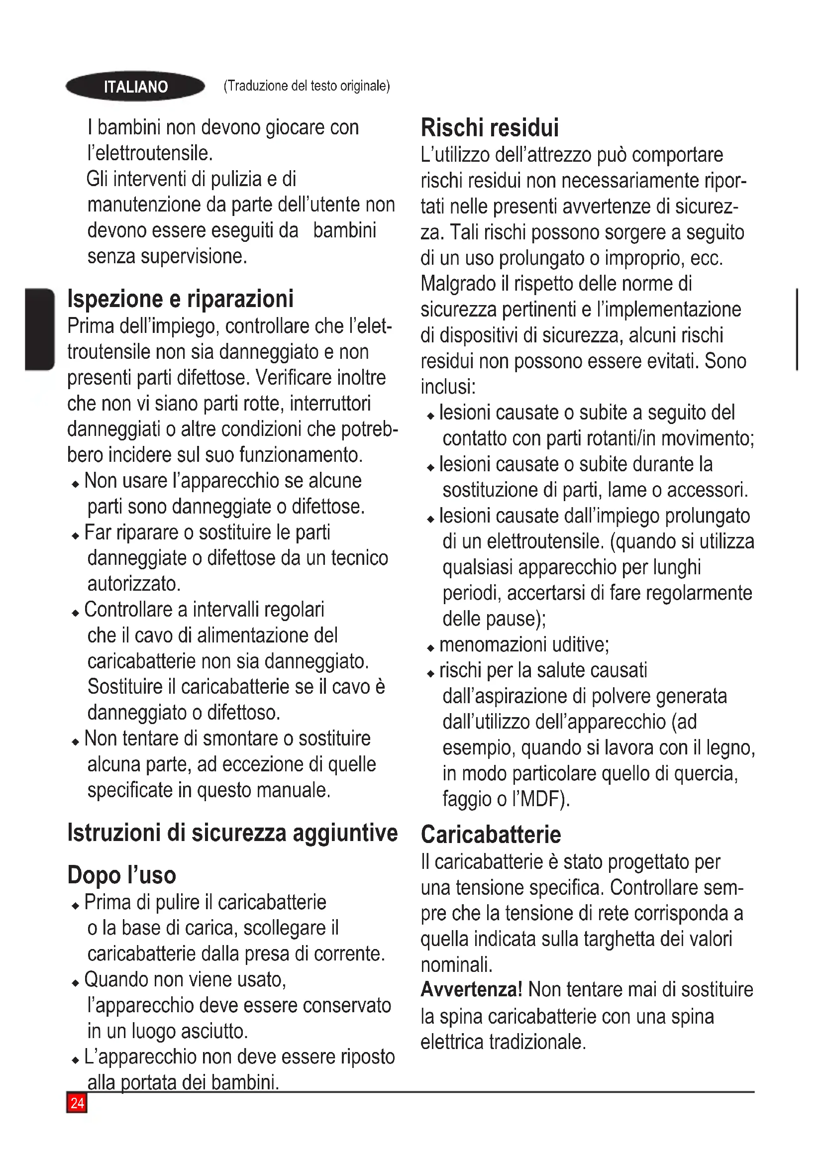 Avvertenza! Leggere attentamente tutte le avvertenze e le istruzioni. L’inosservanza delle avvertenze e istruzioni elencate di seguito potrebbe dar luogo a scossa elettrica, incendi e/olesionigraviallepersone. u L’uso previsto è descritto in questo manuale. Se questo apparecchio viene utilizzato con accessori o per impieghi diversi da quelli raccomandati in questo manuale vi è il rischio che si verichinolesioniallepersone. u Conservare questo manuale per successiva consultazione. Utilizzo dell’apparecchio u Non usare l’apparecchio per aspirare liquidi o materiali che potrebbero incendiarsi. u Non usare l’apparecchio vicino all’acqua. u Non immergere l’apparecchio in acqua. u Non scollegare mai il caricabatteria dalla presa di corrente tirando il cavo di alimentazione. Tenere il cavo di alimentazione del caricabatterie lontano da fonti di calore, olio e bordi taglienti. U Questo elettroutensile può essere usato da bambini dagli 8 anni in su e da persone portatrici di handicap sici,psichiciosensorialiochenon possiedono la dovuta esperienza o conoscenza, purché siano seguiti o opportunamente istruiti sull’uso sicuro e comprendano i pericoli inerenti.24 (Traduzione del testo originale) ITALIANO I bambini non devono giocare con l’elettroutensile. Gliinterventidipuliziaedi manutenzione da parte dell’utente non devono essere eseguiti da bambini senza supervisione. Ispezione e riparazioni Prima dell’impiego, controllare che l’elet- troutensile non sia danneggiato e non presentipartidifettose.Vericareinoltre che non vi siano parti rotte, interruttori danneggiati o altre condizioni che potreb- bero incidere sul suo funzionamento. u Non usare l’apparecchio se alcune parti sono danneggiate o difettose. u Far riparare o sostituire le parti danneggiate o difettose da un tecnico autorizzato. u Controllare a intervalli regolari che il cavo di alimentazione del caricabatterie non sia danneggiato. Sostituire il caricabatterie se il cavo è danneggiato o difettoso. u Non tentare di smontare o sostituire alcuna parte, ad eccezione di quelle specicateinquestomanuale. Istruzioni di sicurezza aggiuntive Dopo l’uso u Prima di pulire il caricabatterie o la base di carica, scollegare il caricabatterie dalla presa di corrente. u Quando non viene usato, l’apparecchio deve essere conservato in un luogo asciutto. u L’apparecchio non deve essere riposto alla portata dei bambini. Rischi residui L’utilizzo dell’attrezzo può comportare rischi residui non necessariamente ripor- tati nelle presenti avvertenze di sicurez- za. Tali rischi possono sorgere a seguito di un uso prolungato o improprio, ecc. Malgrado il rispetto delle norme di sicurezza pertinenti e l’implementazione di dispositivi di sicurezza, alcuni rischi residui non possono essere evitati. Sono inclusi: u lesioni causate o subite a seguito del contattoconpartirotanti/inmovimento; u lesioni causate o subite durante la sostituzione di parti, lame o accessori. u lesioni causate dall’impiego prolungato di un elettroutensile. (quando si utilizza qualsiasi apparecchio per lunghi periodi, accertarsi di fare regolarmente delle pause); u menomazioni uditive;u rischi per la salute causati dall’aspirazione di polvere generata dall’utilizzo dell’apparecchio (ad esempio, quando si lavora con il legno, in modo particolare quello di quercia, faggio o l’MDF). Caricabatterie Il caricabatterie è stato progettato per unatensionespecica.Controllaresem- pre che la tensione di rete corrisponda a quella indicata sulla targhetta dei valori nominali. Avvertenza! Non tentare mai di sostituire la spina caricabatterie con una spina elettrica tradizionale.25 (Traduzione del testo originale)ITALIANOu Usare il caricabatterie BLACK+DECKER solo per caricare la batteria dell’apparecchio con il quale è stato fornito. Batterie diverse potrebbero scoppiare, causando lesioni a persone e danni alle cose. u Non tentare mai di caricare batterie non ricaricabili. u In caso di danneggiamento del cavo di alimentazione, farlo riparare dal produttore o presso un Centro di assistenza BLACK+DECKER autorizzato, in modo da evitare pericoli. u Non lasciare che il caricabatterie si bagni. u Non aprire il caricabatterie.u Non collegare il caricabatterie a sonde.u L’apparecchio o la batteria devono essere lasciati in una zona ben ventilata durante la carica. Sicurezza elettrica Simboli sul caricabatterie