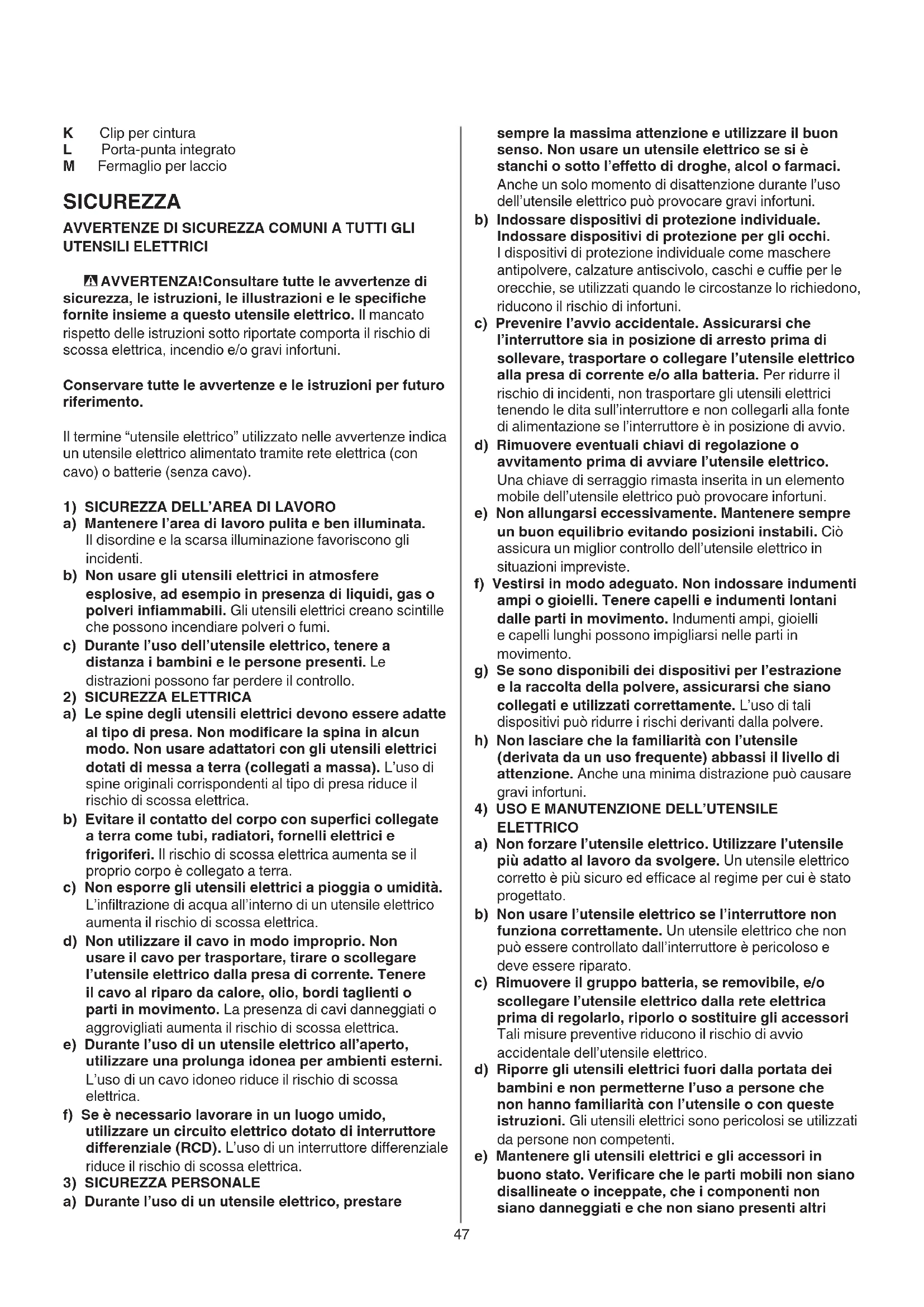 ELETTRICO a) Non forzare l’utensile elettrico. Utilizzare l’utensile più adatto al lavoro da svolgere. Un utensile elettrico corretto è più sicuro ed ecace al regime per cui è stato progettato. b) Non usare l’utensile elettrico se l’interruttore non funziona correttamente. Un utensile elettrico che non può essere controllato dall’interruttore è pericoloso e deve essere riparato. c) Rimuovere il gruppo batteria, se removibile, e/o scollegare l’utensile elettrico dalla rete elettrica prima di regolarlo, riporlo o sostituire gli accessori Tali misure preventive riducono il rischio di avvio accidentale dell’utensile elettrico. d) Riporre gli utensili elettrici fuori dalla portata dei bambini e non permetterne l’uso a persone che non hanno familiarità con l’utensile o con queste istruzioni. Gli utensili elettrici sono pericolosi se utilizzati da persone non competenti. e) Mantenere gli utensili elettrici e gli accessori in buono stato. Vericare che le parti mobili non siano disallineate o inceppate, che i componenti non siano danneggiati e che non siano presenti altri K Clip per cintura L Porta-punta integrato M Fermaglio per laccio SICUREZZA AVVERTENZE DI SICUREZZA COMUNI A TUTTI GLI UTENSILI ELETTRICI - AVVERTENZA!Consultare tutte le avvertenze di sicurezza, le istruzioni, le illustrazioni e le speciche fornite insieme a questo utensile elettrico. Il mancato rispetto delle istruzioni sotto riportate comporta il rischio di scossa elettrica, incendio e/o gravi infortuni. Conservare tutte le avvertenze e le istruzioni per futuro riferimento. Il termine “utensile elettrico” utilizzato nelle avvertenze indica un utensile elettrico alimentato tramite rete elettrica (con cavo) o batterie (senza cavo).
