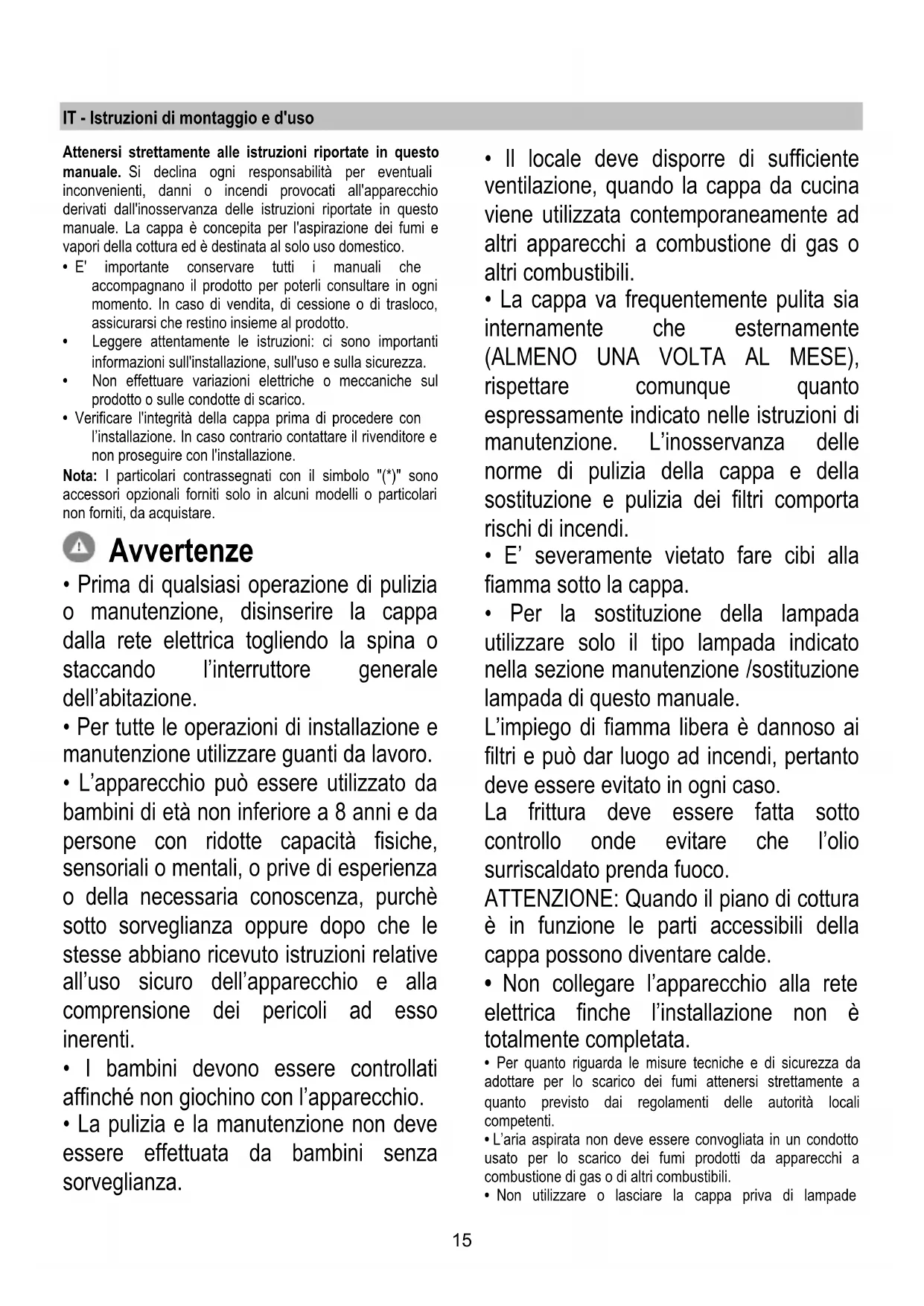 - Non utilizzare o lasciare la cappa priva di lampade16 correttamente montate per possibile rischio di scossa elettrica.
