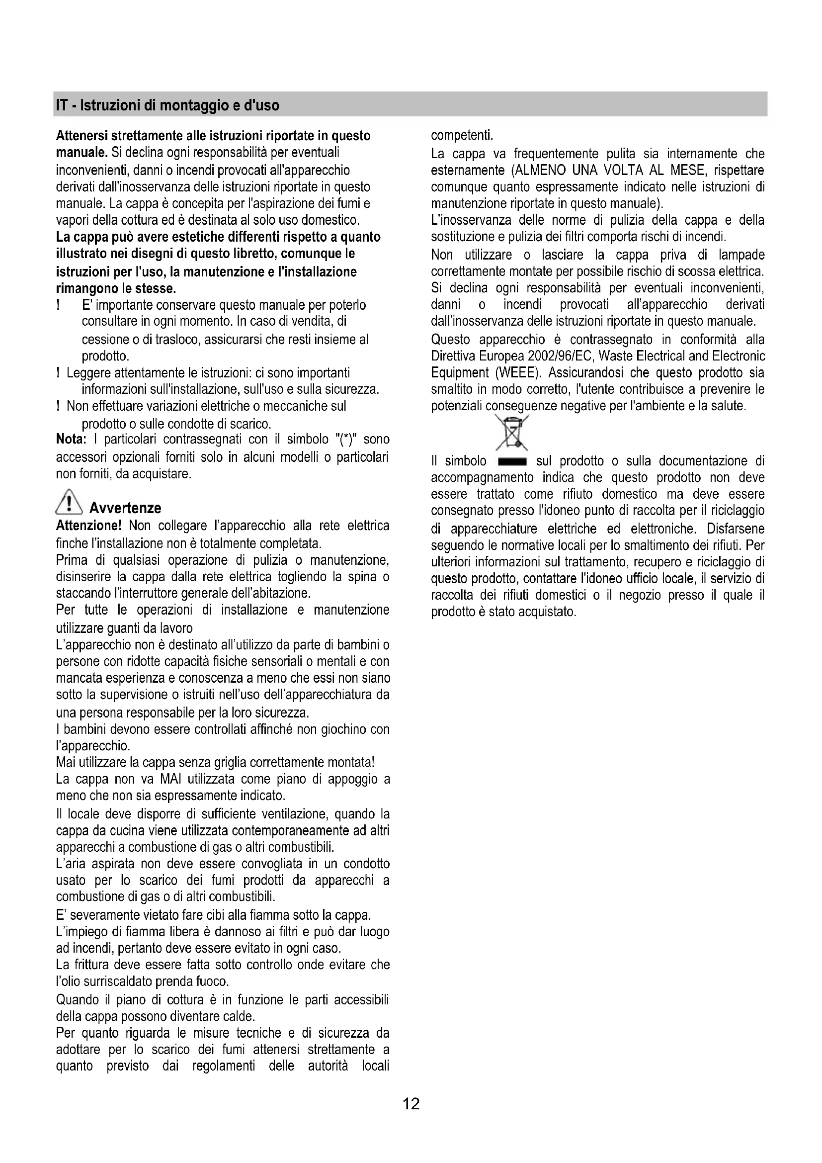 RU Инструкции по монтажу и эксплуатации UK Інструкція з монтажу і експлуатації ET Paigaldus- ja kasutusjuhend LT montavimo ir naudojimosi instrukcija LV ierīkošanas un izmantošanas instrukcija SR Uputstva za montažu i upotrebu SL Navodila za montažo in uporabo HR Uputstva za montažu i za uporabu TR Montaj ve kullanım talimatları AR لﺎﻤﻌﺘﺳﻻاو ﺐﻴآﺮﺘﻟا قﺮﻃ12 IT - Istruzioni di montaggio e d'uso Attenersi strettamente alle istruzioni riportate in questo manuale. Si declina ogni responsabilità per eventuali inconvenienti, danni o incendi provocati all'apparecchio derivati dall'inosservanza delle istruzioni riportate in questo manuale. La cappa è concepita per l'aspirazione dei fumi e vapori della cottura ed è destinata al solo uso domestico. La cappa può avere estetiche differenti rispetto a quanto illustrato nei disegni di questo libretto, comunque le istruzioni per l'uso, la manutenzione e l'installazione rimangono le stesse. ! E' importante conservare questo manuale per poterlo consultare in ogni momento. In caso di vendita, di cessione o di trasloco, assicurarsi che resti insieme al prodotto. ! Leggere attentamente le istruzioni: ci sono importanti informazioni sull'installazione, sull'uso e sulla sicurezza. ! Non effettuare variazioni elettriche o meccaniche sul prodotto o sulle condotte di scarico. Nota: I particolari contrassegnati con il simbolo "(*)" sono accessori opzionali forniti solo in alcuni modelli o particolari non forniti, da acquistare. Avvertenze Attenzione! Non collegare l’apparecchio alla rete elettrica finche l’installazione non è totalmente completata. Prima di qualsiasi operazione di pulizia o manutenzione, disinserire la cappa dalla rete elettrica togliendo la spina o staccando l’interruttore generale dell’abitazione. Per tutte le operazioni di installazione e manutenzione utilizzare guanti da lavoro L’apparecchio non è destinato all’utilizzo da parte di bambini o persone con ridotte capacità fisiche sensoriali o mentali e con mancata esperienza e conoscenza a meno che essi non siano sotto la supervisione o istruiti nell’uso dell’apparecchiatura da una persona responsabile per la loro sicurezza. I bambini devono essere controllati affinché non giochino con l’apparecchio. Mai utilizzare la cappa senza griglia correttamente montata! La cappa non va MAI utilizzata come piano di appoggio a meno che non sia espressamente indicato. Il locale deve disporre di sufficiente ventilazione, quando la cappa da cucina viene utilizzata contemporaneamente ad altri apparecchi a combustione di gas o altri combustibili. L’aria aspirata non deve essere convogliata in un condotto usato per lo scarico dei fumi prodotti da apparecchi a combustione di gas o di altri combustibili. E’ severamente vietato fare cibi alla fiamma sotto la cappa. L’impiego di fiamma libera è dannoso ai filtri e può dar luogo ad incendi, pertanto deve essere evitato in ogni caso. La frittura deve essere fatta sotto controllo onde evitare che l’olio surriscaldato prenda fuoco. Quando il piano di cottura è in funzione le parti accessibili della cappa possono diventare calde. Per quanto riguarda le misure tecniche e di sicurezza da adottare per lo scarico dei fumi attenersi strettamente a quanto previsto dai regolamenti delle autorità locali competenti. La cappa va frequentemente pulita sia internamente che esternamente (ALMENO UNA VOLTA AL MESE, rispettare comunque quanto espressamente indicato nelle istruzioni di manutenzione riportate in questo manuale). L’inosservanza delle norme di pulizia della cappa e della sostituzione e pulizia dei filtri comporta rischi di incendi. Non utilizzare o lasciare la cappa priva di lampade correttamente montate per possibile rischio di scossa elettrica. Si declina ogni responsabilità per eventuali inconvenienti, danni o incendi provocati all’apparecchio derivati dall’inosservanza delle istruzioni riportate in questo manuale. Questo apparecchio è contrassegnato in conformità alla Direttiva Europea 2002/96/EC, Waste Electrical and Electronic Equipment (WEEE). Assicurandosi che questo prodotto sia smaltito in modo corretto, l'utente contribuisce a prevenire le potenziali conseguenze negative per l'ambiente e la salute. Il simbolo sul prodotto o sulla documentazione di accompagnamento indica che questo prodotto non deve essere trattato come rifiuto domestico ma deve essere consegnato presso l'idoneo punto di raccolta per il riciclaggio di apparecchiature elettriche ed elettroniche. Disfarsene seguendo le normative locali per lo smaltimento dei rifiuti. Per ulteriori informazioni sul trattamento, recupero e riciclaggio di questo prodotto, contattare l'idoneo ufficio locale, il servizio di raccolta dei rifiuti domestici o il negozio presso il quale il prodotto è stato acquistato.13 Utilizzazione La cappa è realizzata per essere utilizzata in versione aspirante ad evacuazione esterna o filtrante a ricircolo interno. Versione aspirante I vapori vengono evacuati verso l’esterno tramite un tubo di scarico fissato alla flangia di raccordo. Il diametro del tubo di scarico deve essere equivalente al diametro dell'anello di connessione. Attenzione! Il tubo di evacuazione non è fornito e va acquistato. Nella parte orizzontale, il tubo deve avere una leggera inclinazione verso l’alto (10° circa) in modo da poter trasportare l’aria verso l’esterno più facilmente. Se la cappa è provvista di filtri al carbone, questi devono essere tolti. Collegare la cappa a tubi e fori di scarico a parete con diametro equivalente all'uscita d'aria (flangia di raccordo). L'utilizzo di tubi e fori di scarico a parete con diametro inferiore determinerà una diminuizione delle prestazioni di aspirazione ed un drastico aumento della rumorosità. Si declina perciò ogni responsabilità in merito. ! Usare un condotto lungo il minimo indispensabile. ! Usare un con