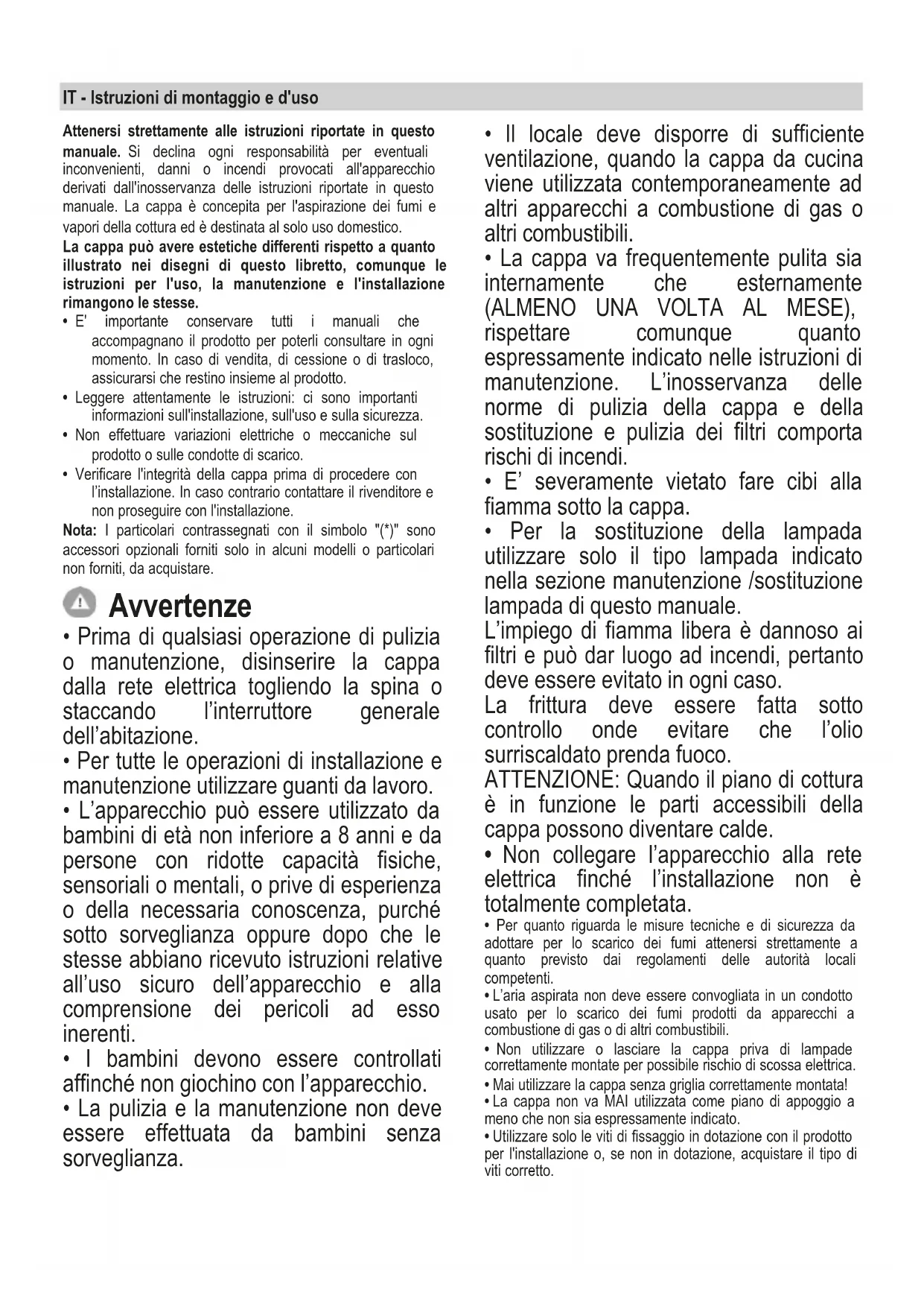 BIT - Istruzioni di montaggio e d'uso Attenersi strettamente alle istruzioni riportate in questo manuale. Si declina ogni responsabilità per eventuali inconvenienti, danni o incendi provocati all'apparecchio derivati dall'inosservanza delle istruzioni riportate in questo manuale. La cappa è concepita per l'aspirazione dei fumi e vapori della cottura ed è destinata al solo uso domestico. La cappa può avere estetiche differenti rispetto a quanto illustrato nei disegni di questo libretto, comunque le istruzioni per l'uso, la manutenzione e l'installazione rimangono le stesse.