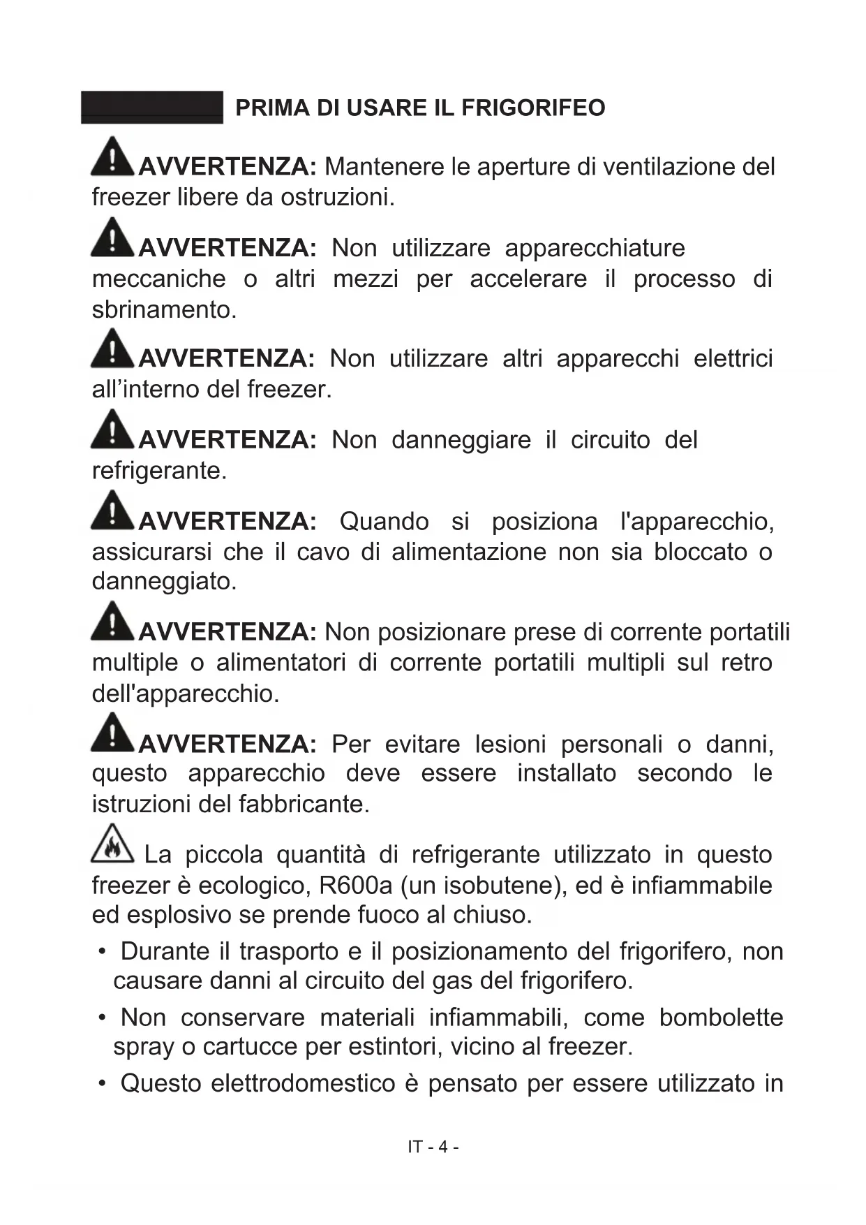 Consigli per il risparmio energetico ................................................................. 21 PARTI DELL’APPARECCHIO E SCOMPARTI ....................................... 22IT - 4 - PRIMA DI USARE IL FRIGORIFEO PARTE - 1. AVVERTENZA: Mantenere le aperture di ventilazione del freezer libere da ostruzioni. AVVERTENZA: Non utilizzare apparecchiature meccaniche o altri mezzi per accelerare il processo di sbrinamento. AVVERTENZA: Non utilizzare altri apparecchi elettrici all’interno del freezer. AVVERTENZA: Non danneggiare il circuito del refrigerante. AVVERTENZA: Quando si posiziona l'apparecchio, assicurarsi che il cavo di alimentazione non sia bloccato o danneggiato. AVVERTENZA: Non posizionare prese di corrente portatili multiple o alimentatori di corrente portatili multipli sul retro dell'apparecchio. AVVERTENZA: Per evitare lesioni personali o danni, questo apparecchio deve essere installato secondo le istruzioni del fabbricante. La piccola quantità di refrigerante utilizzato in questo freezer è ecologico, R600a (un isobutene), ed è infiammabile ed esplosivo se prende fuoco al chiuso.