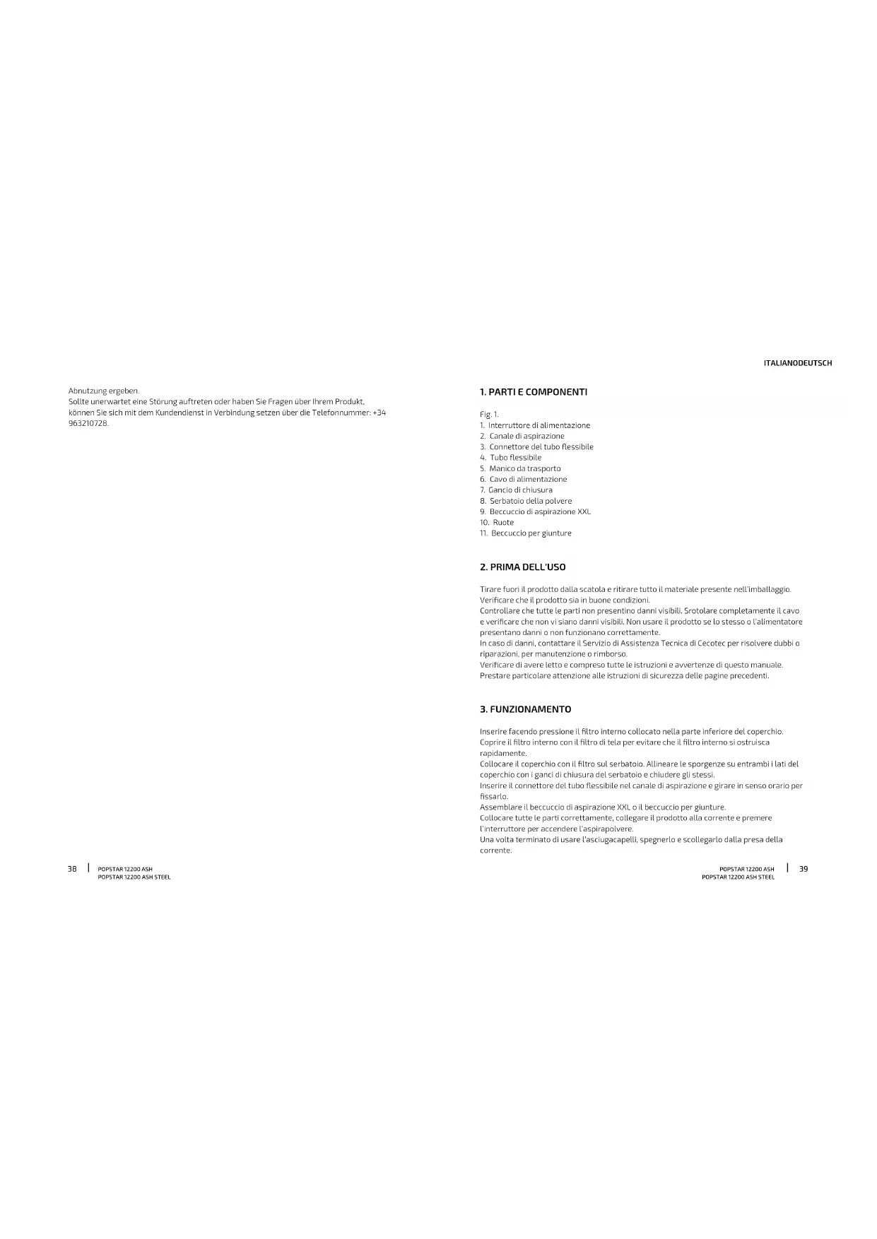 - Se il problema è stato generato da un’usura normale dei pezzi dovuta all’uso. Il servizio di garanzia copre tutti i difetti di fabbricazione per 2 anni secondo la legislazione in vigore, ad eccezione dei pezzi consumabili. Nel caso di cattivo uso da parte dell’utente, il servizio di garanzia non si farà responsabile della riparazione. Qualora ci fosse un problema con il prodotto o avere una consulenza, contattare il Servizio di Assistenza Tecnica uciale di Cecotec attraverso il numero di telefono +34 96 321 07 28.POPSTAR 12200 ASH