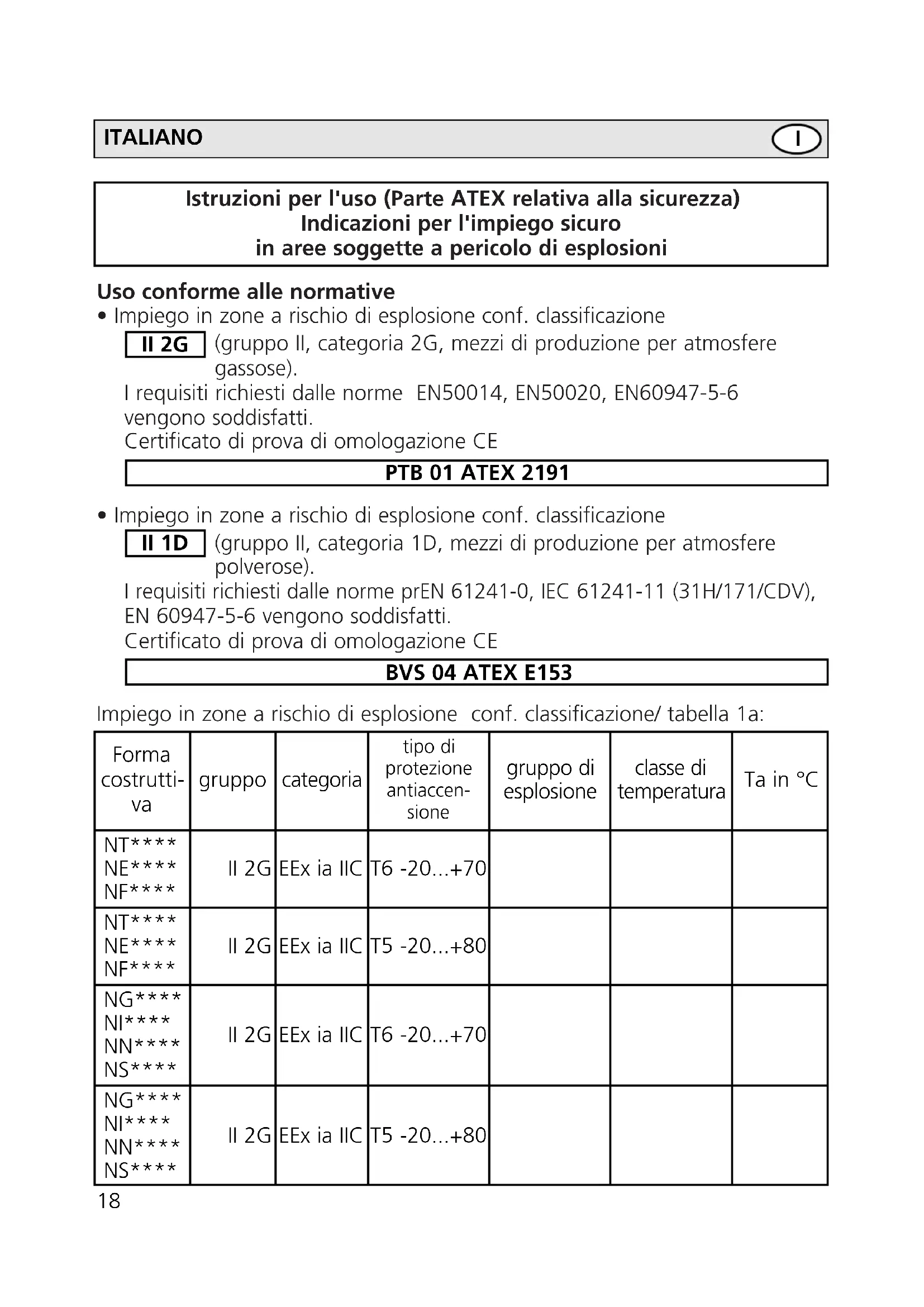 gruppo categoria tipo di protezione antiaccen- sione gruppo di esplosione classe di temperatura Ta in °C NE**** NF**** NG**** NN**** NS**** NT**** II 1D Ex iaD 90°C -20...+70 NE**** NF**** NG**** NN**** NS**** NT**** II 1D Ex iaD 100°C -20...+80 II 2G EEx ia IIC T6 CE0158 II 1D Ex iaD 20 T 90°C II 1D Ex iaD 20 T 100°C II 2G EEx ia IIC T5 CE0158 Forma costruttiva NT****, NE****, NF**** Forma costruttiva NT****, NE****, NF**** Forma costruttiva NG****, NI****, NN****,NS**** Forma costruttiva NG****, NI****, NN****, NS**** II 2G EEx ia IIC T6 CE0158 II 1D Ex iaD 20 T 90°C II 2G EEx ia IIC T5 CE0158 II 1D Ex iaD 20 T 100°C• Collegare solo a circuiti di corrente a sicurezza intrinseca, i quali sono dotati del certificato di prova di omologazione CE e che non superano i seguenti valori massimi: