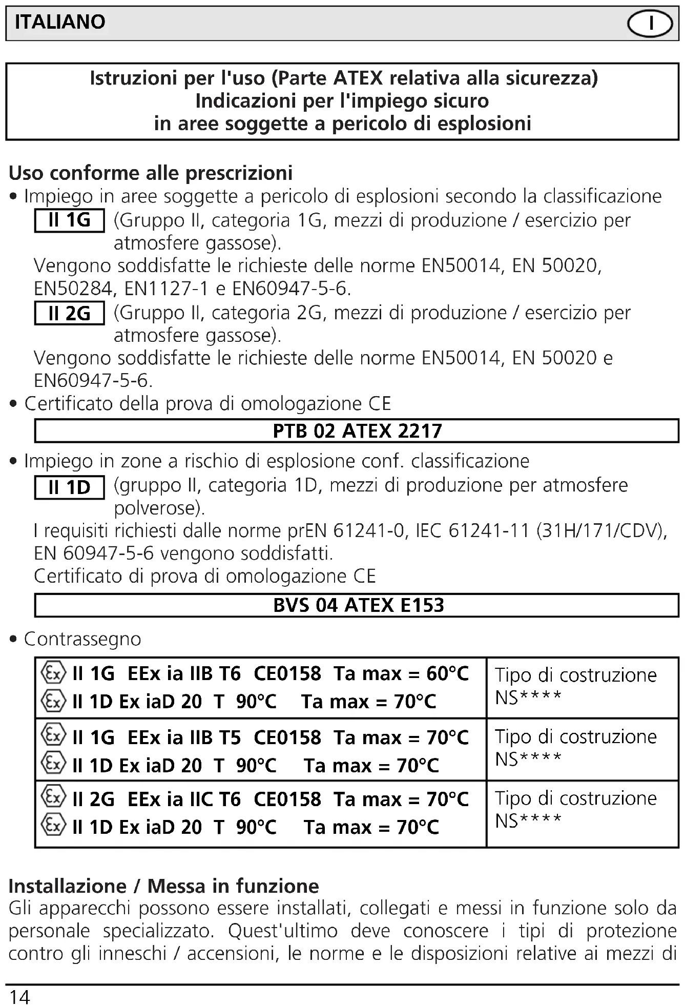 II 1G II 2G II 1D II 1G EEx ia IIB T6 CE0158 Ta max = 60°C II 1D Ex iaD 20 T 90°C Ta max = 70°C II 1D Ex iaD 20 T 90°C Ta max = 70°C II 1G EEx ia IIB T5 CE0158 Ta max = 70°C Tipo di costruzione NS**** Tipo di costruzione NS**** Tipo di costruzione NS**** II 2G EEx ia IIC T6 CE0158 Ta max = 70°C II 1D Ex iaD 20 T 90°C Ta max = 70°Cproduzione / esercizio nelle aree soggette ad esplosioni. Controllare, se la classificazione (vedi sopra "Contrassegno" e la sigla sull'apparecchio) è adatta per la specifica applicazione.