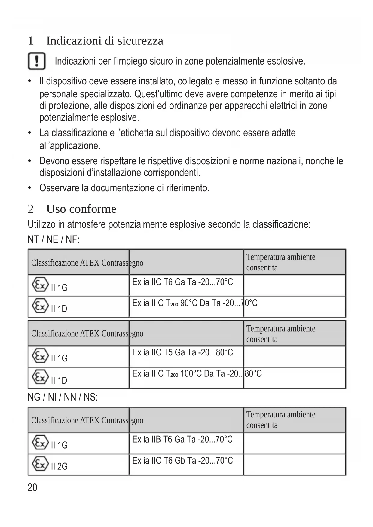 - Osservare la documentazione di riferimento. 2 Uso conforme Utilizzo in atmosfere potenzialmente esplosive secondo la classificazione: NT / NE / NF: Classificazione ATEX Contrassegno Temperatura ambiente consentita II 1G Ex ia IIC T6 Ga Ta -20 p. 70