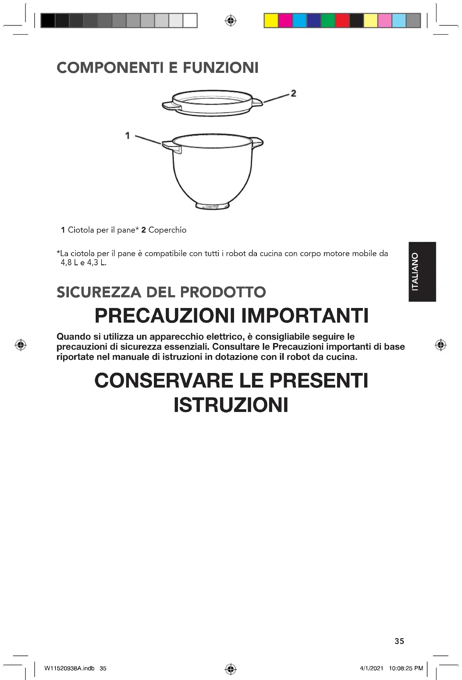 PRECAUZIONI IMPORTANTI Quando si utilizza un apparecchio elettrico, èconsigliabile seguire le precauzioni di sicurezza essenziali. Consultare le Precauzioni importanti di base riportate nel manuale di istruzioni in dotazione con il robot da cucina.