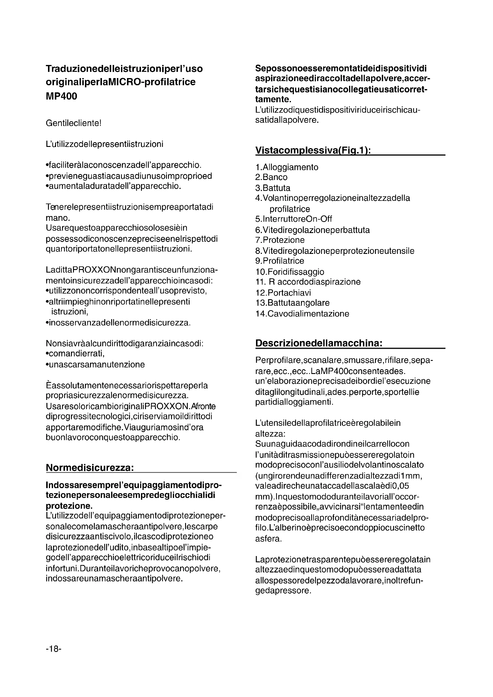 può essere eseguita come descritto in „Re- golazione della battuta longitudinale“. Battuta angolare (Fig. 1, Pos. 13): Questa può essere inserita nella relativa scana- latura in cui è possibile spostarla anche in avanti ed indietro. Per la regolazione è necessario svi- tare il dado zigrinato e ruotare l’elemento di pla- stica. Lavorare con la Micro-profilatrice: Attenzione! Durante i lavori indossare sempre una protezio- ne per l’udito! Attenzione! Non lavorare mai senza il dispositivo di protezio- ne (Pos. 7, Fig 1)! La protezione deve essere regolata in modo tale da coprire la fresatrice sul pezzo da lavorare. Durante la profilatura di pezzi da lavorare supe- riori a 5 mm altezza/spessore prestare particola- re attenzione. Non afferrare mai l’utensile mentre gira! - 20 -- 21 - Il pezzo da lavorare può avere una lunghezza ed una larghezza tale da essere posizionato be- ne sul banco di lavoro in modo tale da poter es- sere ben guidato (max. ca. 200 mm x 500 mm) Lo spessore massimo dei trucioli non deve su- perare mai 1 mm. Per la creazione del profilo il pezzo da lavorare viene fatto scorrere sul pezzo da lavorare come illustrato già nella Fig. 5. È inoltre necessario accertarsi che la profilazio- ne (quindi quanto rimosso) e la velocità di scorri- mento non siano troppo grandi! Una rimozione eccessiva ed una velocità di scorrimento troppo elevata determinano dei ri- sultati di fresatura peggiori e sollecitano inutil- mente la meccanica della macchina. Si consiglia pertanto di eseguire diversi passag- gi di lavoro e regolare più spesso la battuta o l’altezza della profilatrice. Attenzione! Si consiglia di lavorare sempre con l’aspirapol- vere. A tal fine sulla parte posteriore dell’appa- recchio è presente un manicotto di aspirazione di gomma. Qui è possibile collegare in modo pratico un aspirapolvere. Un suggerimento: Quando si utilizza l’aspiratore Proxxon CW-ma- tic non è necessario accendere e spegnere con- tinuamente. CW-matic è dotato di un’unità di co- mando che si attiva o si disattiva automatica- mente con l’utensile elettrico. Cura e manutenzione: Attenzione! Fare sostituire da un tecnico specializzato i sin- goli componenti difettosi. Attenzione! Per tutte le attività di riparazione e di regolazio- ne togliere sempre la spina di rete! La profilatrice non è soggetta a molta manuten- zione. Per garantire una lunga durata è neces- sario pulire l’apparecchio dopo ogni impiego con un aspirapolvere o un panno morbido. Utilizzare sempre il dispositivo di aspirazione. Smaltimento: Si prega di non smaltire l’apparecchio insieme ai rifiuti domestici! L’apparecchio contiene materiali che possono essere riciclati. Per ulteriori infor- mazioni si prega di contattare l’azienda locale addetta allo smaltimento o altre strutture comu- nali adibite a tale scopo. Dichiarazione di conformità CE Nome ed indirizzo del produttore: PROXXON S.A. 6-10, Härebierg L-6868 Wecker Denominazione dell’apparecchio: MICRO-profilatrice MP 400 N. articolo: 27050 Dichiariamo che i prodotti descritti sono conformi alle disposizioni delle seguenti direttive CE: Direttiva CEE-CEM 2004/108/CEE Norme applicate: DIN EN 55014-1 / 02.2010
