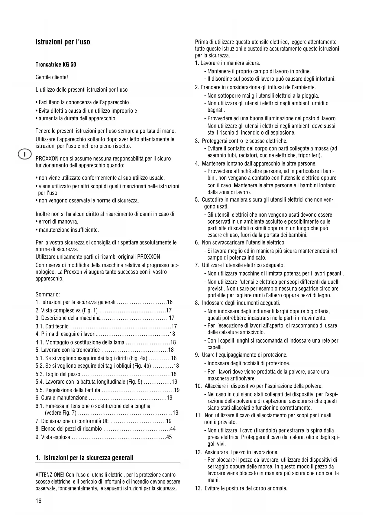 Grazie per aver deciso di acquistare una troncatrice PROXXON KG 50: Questo apparecchio è particolarmente adatto per le piccole, però precise, applicazioni relative al taglio di barre metalliche con un diametro fino a circa 10 mm, per tagliare il legno e barre di mate- riale plastico oppure profili. L'apparecchio è costituito da una testa di taglio con una base del- l'apparecchio in alluminio pressofuso. La testa di taglio com- prende i componenti elettrici dell’apparecchio così come la tras- missione a cinghia dentata per l'azionamento della lama di taglio. Questa viene orientata, per il lavoro, verso l'alto oppure il basso mediante una articolazione nella base dell'apparecchio e nella posizione di riposo viene mantenuta nella posizione superiore mediante una molla. La base dell'apparecchio comprende una tavola circolare, la quale può essere ruotata di 45°: In questo modo è possibile eseguire anche, in maniera semplice e precisa, tagli obliqui. La scala sulla parte laterale consente di impostare, in modo confortevole e pre- ciso, l'angolazione.: Dopo la tavola circolare può essere bloccata mediante una vite zigrinata. Il pezzo da lavorare può essere bloccato, come desiderato, medi- ante una morsa a vite. La morsa a vite ha una apertura di mas- simo 20 mm, nella quale è possibile, mediante un prisma sul lato superiore, bloccare anche dei binari di ferrovia in miniatura dalle dimensioni di HO (vedere la Fig. 6). Il fissaggio dei materiali circo- lari non rappresenta nessun problema grazie all'integrazione di una scanalatura in una ganascia. Anche il taglio a misura di pezzi è possibile senza problemi, grazie ad una corrispondente battuta di arresto. Per questo scopo è pos- sibile impostare una lunghezza massima di 140 mm. L'apparecchio comprende cinque lame di taglio con agglomerante ceramico e una chiave per viti ad esagono cavo. 3.1. Dati tecnici Dimensioni e pesi: Base apparecchio: ca. 100/135 x 132 mm Altezza: ca. 100 mm (nella posizione di riposo della testa di taglio) Larghezza: ca. 140 mm Larghezza ganasce della 17morsa a vite: 30 mm Apertura: 20 mm Peso: ca. 1,5 kg Motor
