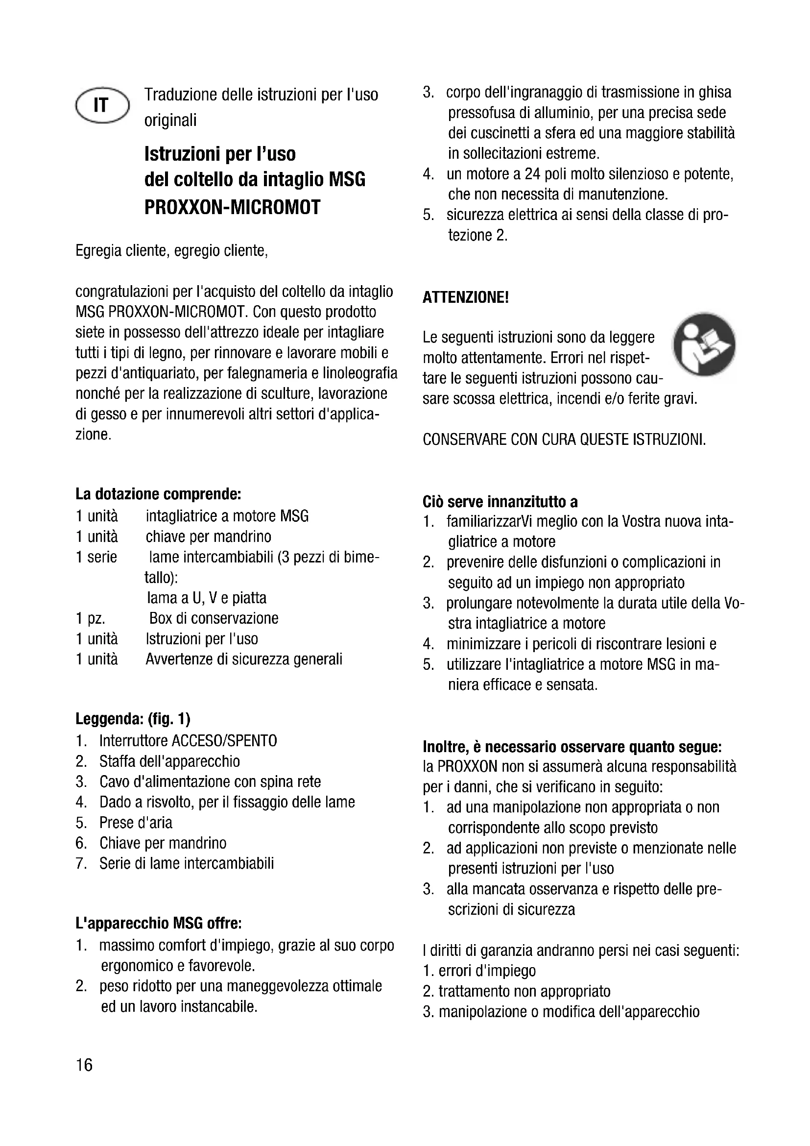 Date : 20.12.2017 Dipl.-Ing. Jörg Wagner PROXXON S.A. Division sécurité des appareils Le responsable de la documentation CE est iden- tique au signataire. 15Traduzione delle istruzioni per l'uso originali Istruzioni per l’uso del coltello da intaglio MSG PROXXON-MICROMOT Egregia cliente, egregio cliente, congratulazioni per l'acquisto del coltello da intaglio MSG PROXXON-MICROMOT. Con questo prodotto siete in possesso dell'attrezzo ideale per intagliare tutti i tipi di legno, per rinnovare e lavorare mobili e pezzi d'antiquariato, per falegnameria e linoleografia nonché per la realizzazione di sculture, lavorazione di gesso e per innumerevoli altri settori d'applica- zione. La dotazione comprende: 1 unità intagliatrice a motore MSG 1 unità chiave per mandrino 1 serie lame intercambiabili (3 pezzi di bime- tallo): lama a U, V e piatta 1 pz. Box di conservazione 1 unità Istruzioni per l'uso 1 unità Avvertenze di sicurezza generali Leggenda: (fig. 1)
