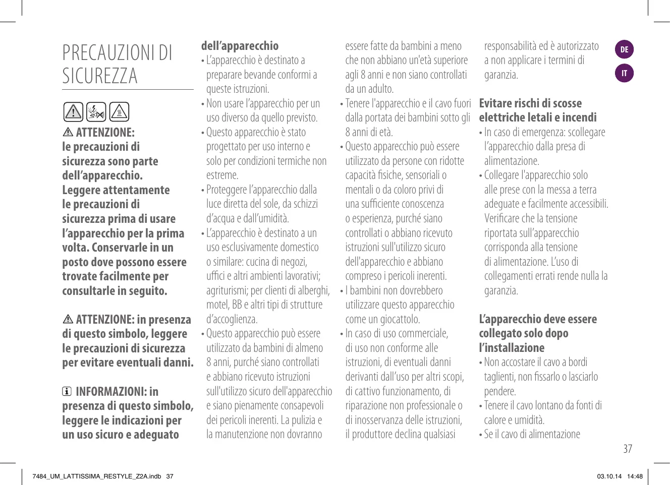 - Proteggere l’apparecchio dalla Leggere attentamente luce diretta del sole, da schizzi le precauzioni di d’acqua e dall’umidità. sicurezza prima di usare l’apparecchio per la prima • L’apparecchio è destinato a un uso esclusivamente domestico volta. Conservarle in un posto dove possono essere o similare: cucina di negozi, uffici e altri ambienti lavorativi; trovate facilmente per agriturismi; per clienti di alberghi, consultarle in seguito. motel, BB e altri tipi di strutture ATTENZIONE: in presenza d’accoglienza. di questo simbolo, leggere • Questo apparecchio può essere utilizzato da bambini di almeno le precauzioni di sicurezza per evitare eventuali danni. 8 anni, purché siano controllati e abbiano ricevuto istruzioni sull'utilizzo sicuro dell'apparecchio INFORMAZIONI: in presenza di questo simbolo, e siano pienamente consapevoli dei pericoli inerenti. La pulizia e leggere le indicazioni per la manutenzione non dovranno un uso sicuro e adeguato PRECAUZIONI DI SICUREZZA 7484_UM_LATTISSIMA_RESTYLE_Z2A.indb 37 essere fatte da bambini a meno che non abbiano un'età superiore agli 8 anni e non siano controllati da un adulto.