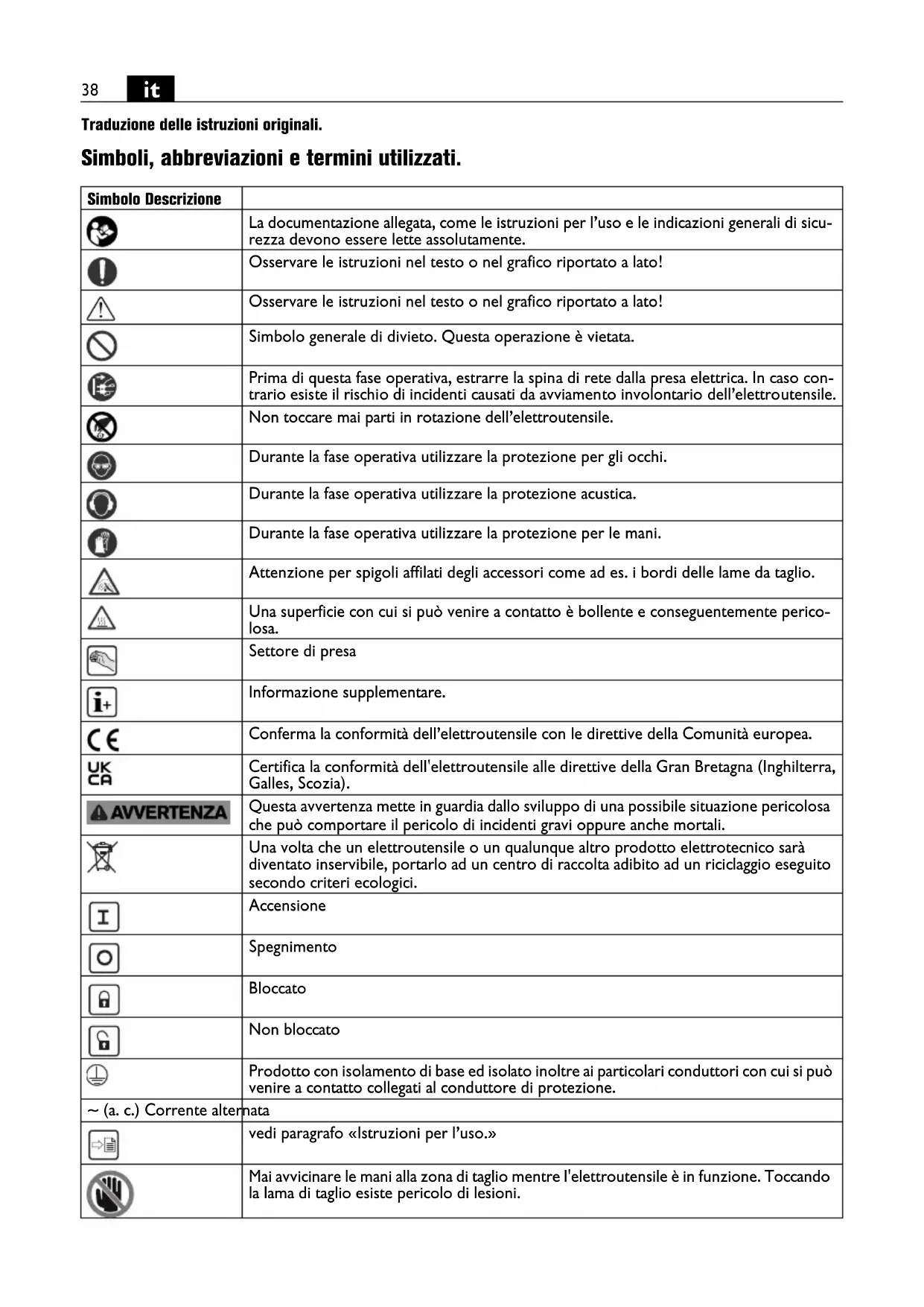 Traduzione delle istruzioni originali. Simboli, abbreviazioni e termini utilizzati. Simbolo Descrizione La documentazione allegata, come le istruzioni per l’uso e le indicazioni generali di sicu- rezza devono essere lette assolutamente. Osservare le istruzioni nel testo o nel grafico riportato a lato! Osservare le istruzioni nel testo o nel grafico riportato a lato! Simbolo generale di divieto. Questa operazione è vietata. Prima di questa fase operativa, estrarre la spina di rete dalla presa elettrica. In caso con- trario esiste il rischio di incidenti causati da avviamento involontario dell’elettroutensile. Non toccare mai parti in rotazione dell’elettroutensile. Durante la fase operativa utilizzare la protezione per gli occhi. Durante la fase operativa utilizzare la protezione acustica. Durante la fase operativa utilizzare la protezione per le mani. Attenzione per spigoli affilati degli accessori come ad es. i bordi delle lame da taglio. Una superficie con cui si può venire a contatto è bollente e conseguentemente perico- losa. Settore di presa Informazione supplementare. Conferma la conformità dell’elettroutensile con le direttive della Comunità europea. Certifica la conformità dell'elettroutensile alle direttive della Gran Bretagna (Inghilterra, Galles, Scozia). Questa avvertenza mette in guardia dallo sviluppo di una possibile situazione pericolosa che può comportare il pericolo di incidenti gravi oppure anche mortali. Una volta che un elettroutensile o un qualunque altro prodotto elettrotecnico sarà diventato inservibile, portarlo ad un centro di raccolta adibito ad un riciclaggio eseguito secondo criteri ecologici. Accensione Spegnimento Bloccato Non bloccato Prodotto con isolamento di base ed isolato inoltre ai particolari conduttori con cui si può venire a contatto collegati al conduttore di protezione. ~ (a. c.) Corrente alternata vedi paragrafo «Istruzioni per l’uso.» Mai avvicinare le mani alla zona di taglio mentre l'elettroutensile è in funzione. Toccando la lama di taglio esiste pericolo di lesioni.39