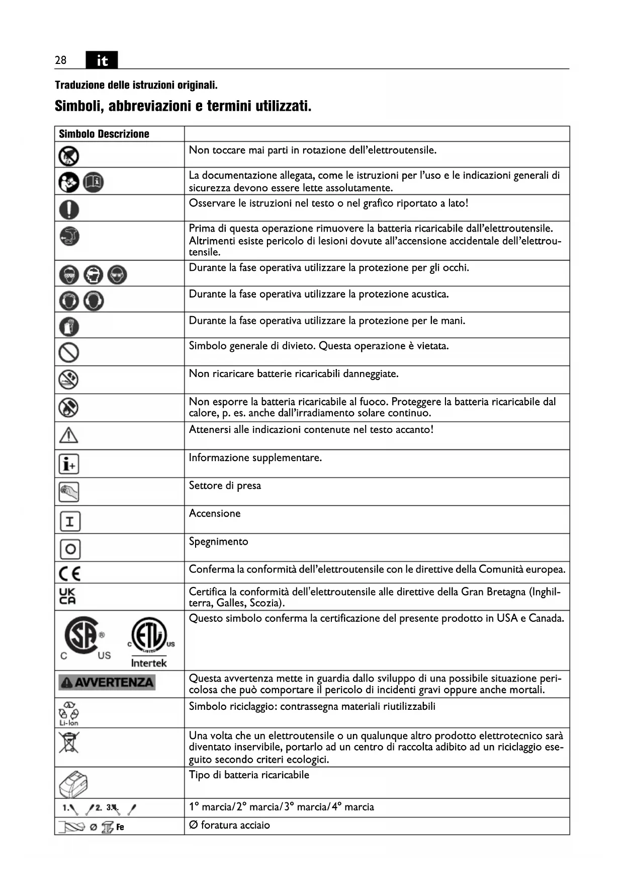 Traduzione delle istruzioni originali. Simboli, abbreviazioni e termini utilizzati. Simbolo Descrizione Non toccare mai parti in rotazione dell’elettroutensile. La documentazione allegata, come le istruzioni per l’uso e le indicazioni generali di sicurezza devono essere lette assolutamente. Osservare le istruzioni nel testo o nel grafico riportato a lato! Prima di questa operazione rimuovere la batteria ricaricabile dall’elettroutensile. Altrimenti esiste pericolo di lesioni dovute all’accensione accidentale dell’elettrou- tensile. Durante la fase operativa utilizzare la protezione per gli occhi. Durante la fase operativa utilizzare la protezione acustica. Durante la fase operativa utilizzare la protezione per le mani. Simbolo generale di divieto. Questa operazione è vietata. Non ricaricare batterie ricaricabili danneggiate. Non esporre la batteria ricaricabile al fuoco. Proteggere la batteria ricaricabile dal calore, p. es. anche dall’irradiamento solare continuo. Attenersi alle indicazioni contenute nel testo accanto! Informazione supplementare. Settore di presa Accensione Spegnimento Conferma la conformità dell’elettroutensile con le direttive della Comunità europea. Certifica la conformità dell'elettroutensile alle direttive della Gran Bretagna (Inghil- terra, Galles, Scozia). Questo simbolo conferma la certificazione del presente prodotto in USA e Canada. Questa avvertenza mette in guardia dallo sviluppo di una possibile situazione peri- colosa che può comportare il pericolo di incidenti gravi oppure anche mortali. Simbolo riciclaggio: contrassegna materiali riutilizzabili Una volta che un elettroutensile o un qualunque altro prodotto elettrotecnico sarà diventato inservibile, portarlo ad un centro di raccolta adibito ad un riciclaggio ese- guito secondo criteri ecologici. Tipo di batteria ricaricabile 1° marcia/2° marcia/3° marcia/4° marcia Ø foratura acciaio