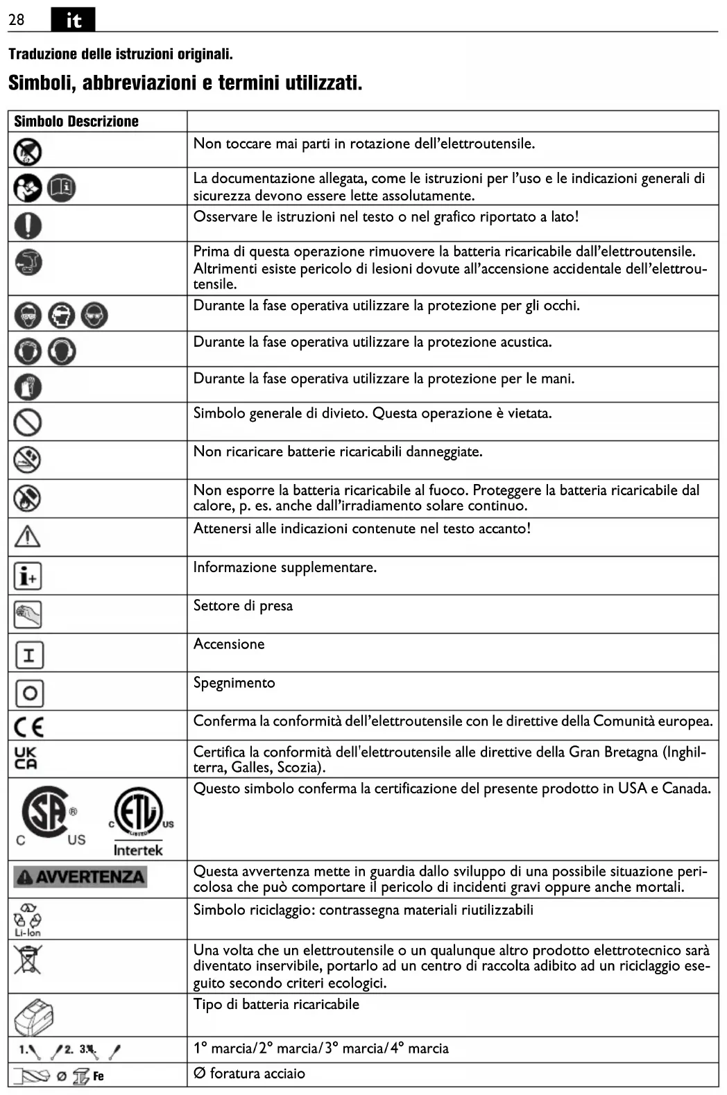 Traduzione delle istruzioni originali. Simboli, abbreviazioni e termini utilizzati. Simbolo Descrizione Non toccare mai parti in rotazione dell’elettroutensile. La documentazione allegata, come le istruzioni per l’uso e le indicazioni generali di sicurezza devono essere lette assolutamente. Osservare le istruzioni nel testo o nel grafico riportato a lato! Prima di questa operazione rimuovere la batteria ricaricabile dall’elettroutensile. Altrimenti esiste pericolo di lesioni dovute all’accensione accidentale dell’elettrou- tensile. Durante la fase operativa utilizzare la protezione per gli occhi. Durante la fase operativa utilizzare la protezione acustica. Durante la fase operativa utilizzare la protezione per le mani. Simbolo generale di divieto. Questa operazione è vietata. Non ricaricare batterie ricaricabili danneggiate. Non esporre la batteria ricaricabile al fuoco. Proteggere la batteria ricaricabile dal calore, p. es. anche dall’irradiamento solare continuo. Attenersi alle indicazioni contenute nel testo accanto! Informazione supplementare. Settore di presa Accensione Spegnimento Conferma la conformità dell’elettroutensile con le direttive della Comunità europea. Certifica la conformità dell'elettroutensile alle direttive della Gran Bretagna (Inghil- terra, Galles, Scozia). Questo simbolo conferma la certificazione del presente prodotto in USA e Canada. Questa avvertenza mette in guardia dallo sviluppo di una possibile situazione peri- colosa che può comportare il pericolo di incidenti gravi oppure anche mortali. Simbolo riciclaggio: contrassegna materiali riutilizzabili Una volta che un elettroutensile o un qualunque altro prodotto elettrotecnico sarà diventato inservibile, portarlo ad un centro di raccolta adibito ad un riciclaggio ese- guito secondo criteri ecologici. Tipo di batteria ricaricabile 1° marcia/2° marcia/3° marcia/4° marcia Ø foratura acciaio