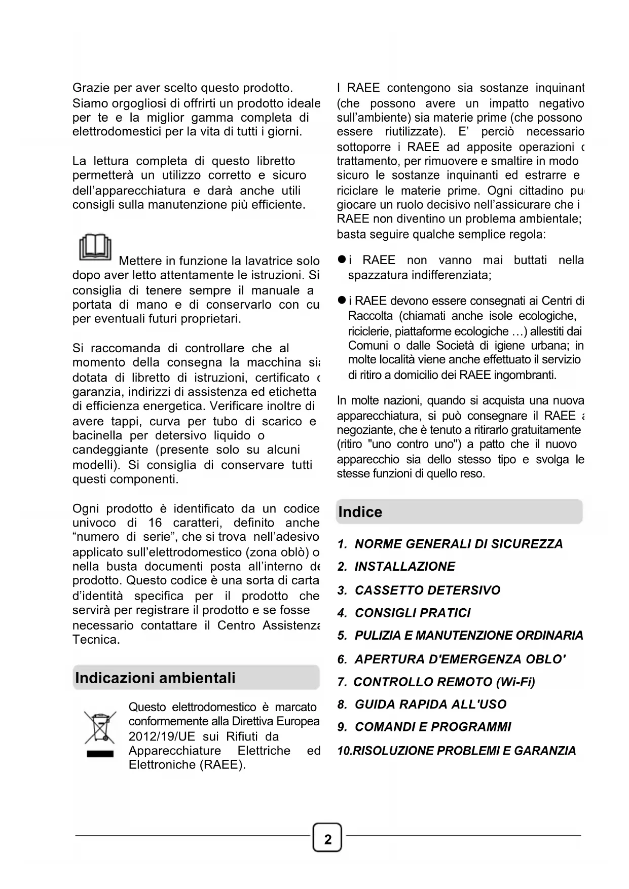 Grazie per aver scelto questo prodotto. Siamo orgogliosi di offrirti un prodotto ideale per te e la miglior gamma completa di elettrodomestici per la vita di tutti i giorni. La lettura completa di questo libretto permetterà un utilizzo corretto e sicuro dell’apparecchiatura e darà anche utili consigli sulla manutenzione più efficiente. Mettere in funzione la lavatrice solo dopo aver letto attentamente le istruzioni. Si consiglia di tenere sempre il manuale a portata di mano e di conservarlo con cura per eventuali futuri proprietari. Si raccomanda di controllare che al momento della consegna la macchina sia dotata di libretto di istruzioni, certificato di garanzia, indirizzi di assistenza ed etichetta di efficienza energetica. Verificare inoltre di avere tappi, curva per tubo di scarico e bacinella per detersivo liquido o candeggiante (presente solo su alcuni modelli). Si consiglia di conservare tutti questi componenti. Ogni prodotto è identificato da un codice univoco di 16 caratteri, definito anche “numero di serie”, che si trova nell’adesivo applicato sull’elettrodomestico (zona oblò) o nella busta documenti posta all’interno del prodotto. Questo codice è una sorta di carta d’identità specifica per il prodotto che servirà per registrare il prodotto e se fosse necessario contattare il Centro Assistenza Tecnica.