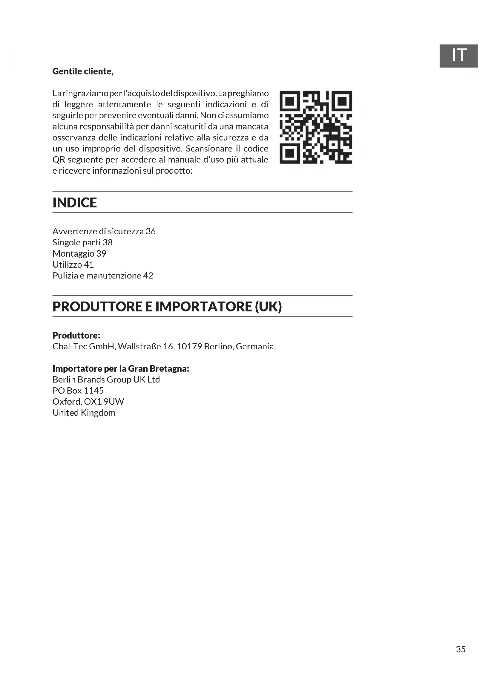Gentile cliente, La ringraziamo per l'acquisto del dispositivo. La preghiamo di leggere attentamente le seguenti indicazioni e di seguirle per prevenire eventuali danni. Non ci assumiamo alcuna responsabilità per danni scaturiti da una mancata osservanza delle indicazioni relative alla sicurezza e da un uso improprio del dispositivo. Scansionare il codice QR seguente per accedere al manuale d'uso più attuale e ricevere informazioni sul prodotto: INDICE Avvertenze di sicurezza 36 Singole parti 38 Montaggio 39 Utilizzo 41 Pulizia e manutenzione 42 PRODUTTORE E IMPORTATORE (UK) Produttore: Chal-Tec GmbH, Wallstraße 16, 10179 Berlino, Germania. Importatore per la Gran Bretagna: Berlin Brands Group UK Ltd PO Box 1145 Oxford, OX1 9UW United Kingdom36