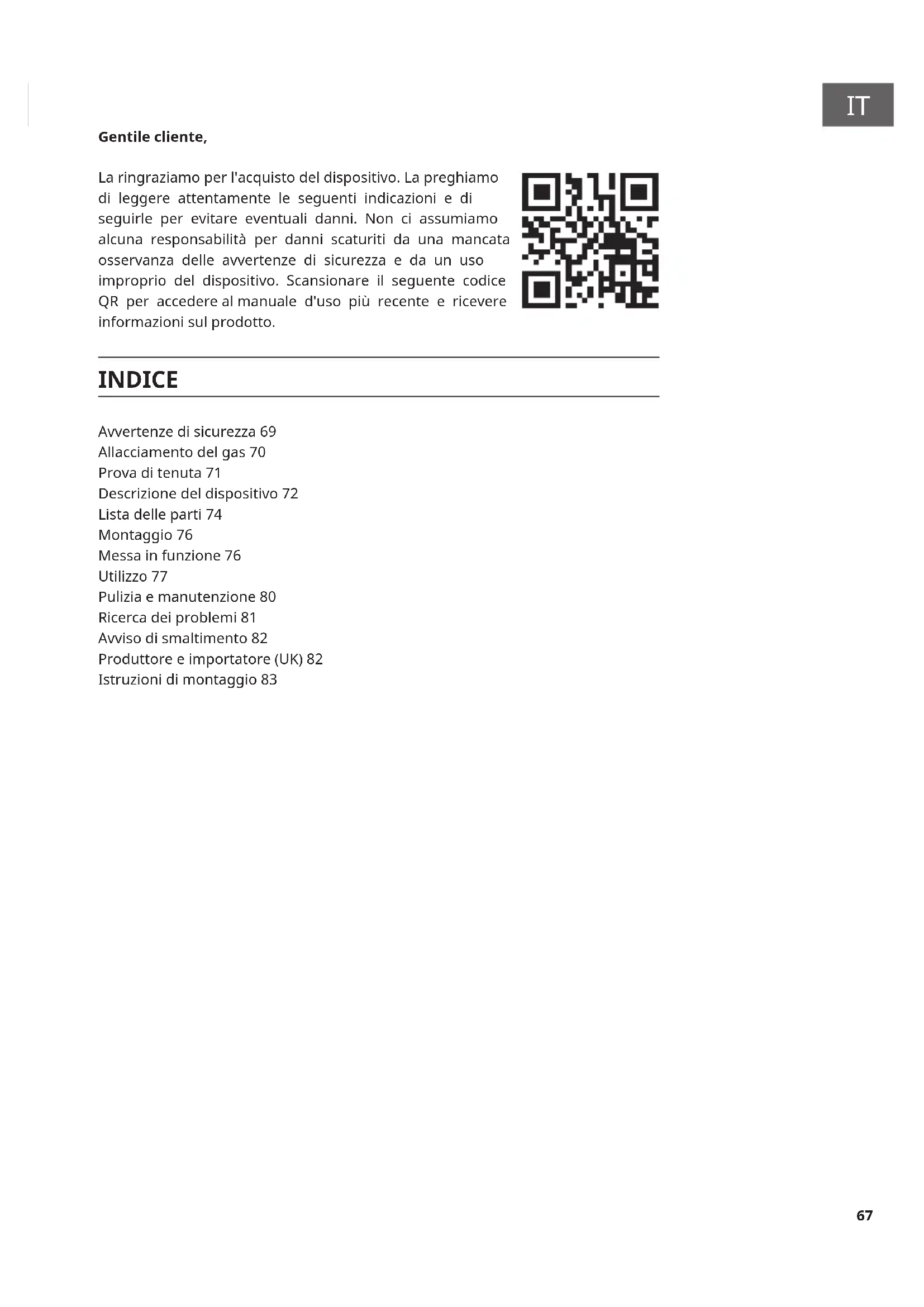 Gentile cliente, La ringraziamo per l'acquisto del dispositivo. La preghiamo di leggere attentamente le seguenti indicazioni e di seguirle per evitare eventuali danni. Non ci assumiamo alcuna responsabilità per danni scaturiti da una mancata osservanza delle avvertenze di sicurezza e da un uso improprio del dispositivo. Scansionare il seguente codice QR per accedere al manuale d'uso più recente e ricevere informazioni sul prodotto. INDICE Avvertenze di sicurezza 69 Allacciamento del gas 70 Prova di tenuta 71 Descrizione del dispositivo 72 Lista delle parti 74 Montaggio 76 Messa in funzione 76 Utilizzo 77 Pulizia e manutenzione 80 Ricerca dei problemi 81 Avviso di smaltimento 82 Produttore e importatore (UK) 82 Istruzioni di montaggio 8368