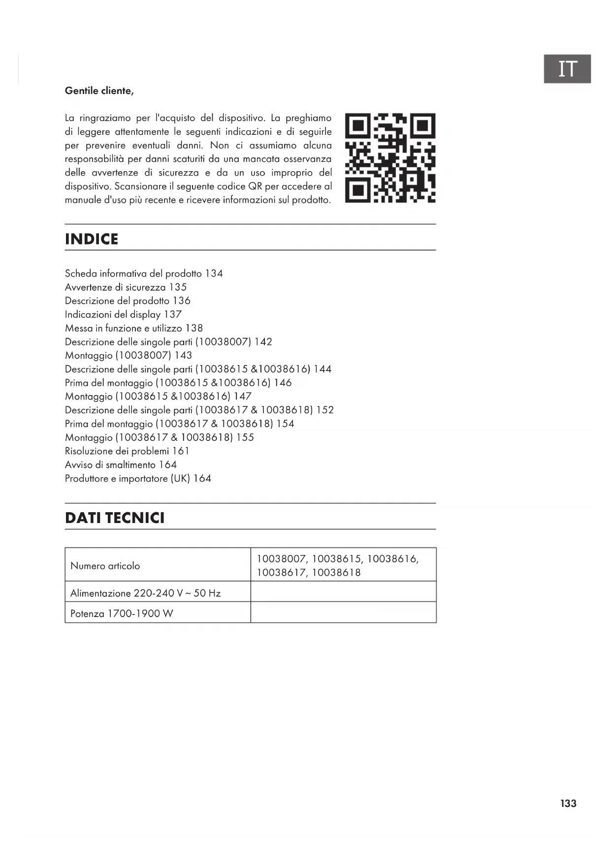 Gentile cliente, La ringraziamo per l'acquisto del dispositivo. La preghiamo di leggere attentamente le seguenti indicazioni e di seguirle per prevenire eventuali danni. Non ci assumiamo alcuna responsabilità per danni scaturiti da una mancata osservanza delle avvertenze di sicurezza e da un uso improprio del dispositivo. Scansionare il seguente codice QR per accedere al manuale d'uso più recente e ricevere informazioni sul prodotto. INDICE Scheda informativa del prodotto134 Avvertenze di sicurezza135 Descrizione del prodotto136 Indicazioni del display137 Messa in funzione e utilizzo138 Descrizione delle singole parti (10038007)142 Montaggio (10038007)143 Descrizione delle singole parti (10038615 &10038616)144 Prima del montaggio (10038615 &10038616)146 Montaggio (10038615 &10038616)147 Descrizione delle singole parti (10038617 & 10038618)152 Prima del montaggio (10038617 & 10038618)154 Montaggio (10038617 & 10038618)155 Risoluzione dei problemi161 Avviso di smaltimento164 Produttore e importatore (UK)164 DATI TECNICI Numero articolo 10038007, 10038615, 10038616, 10038617, 10038618 Alimentazione 220-240 V ~ 50 Hz Potenza 1700-1900 W134