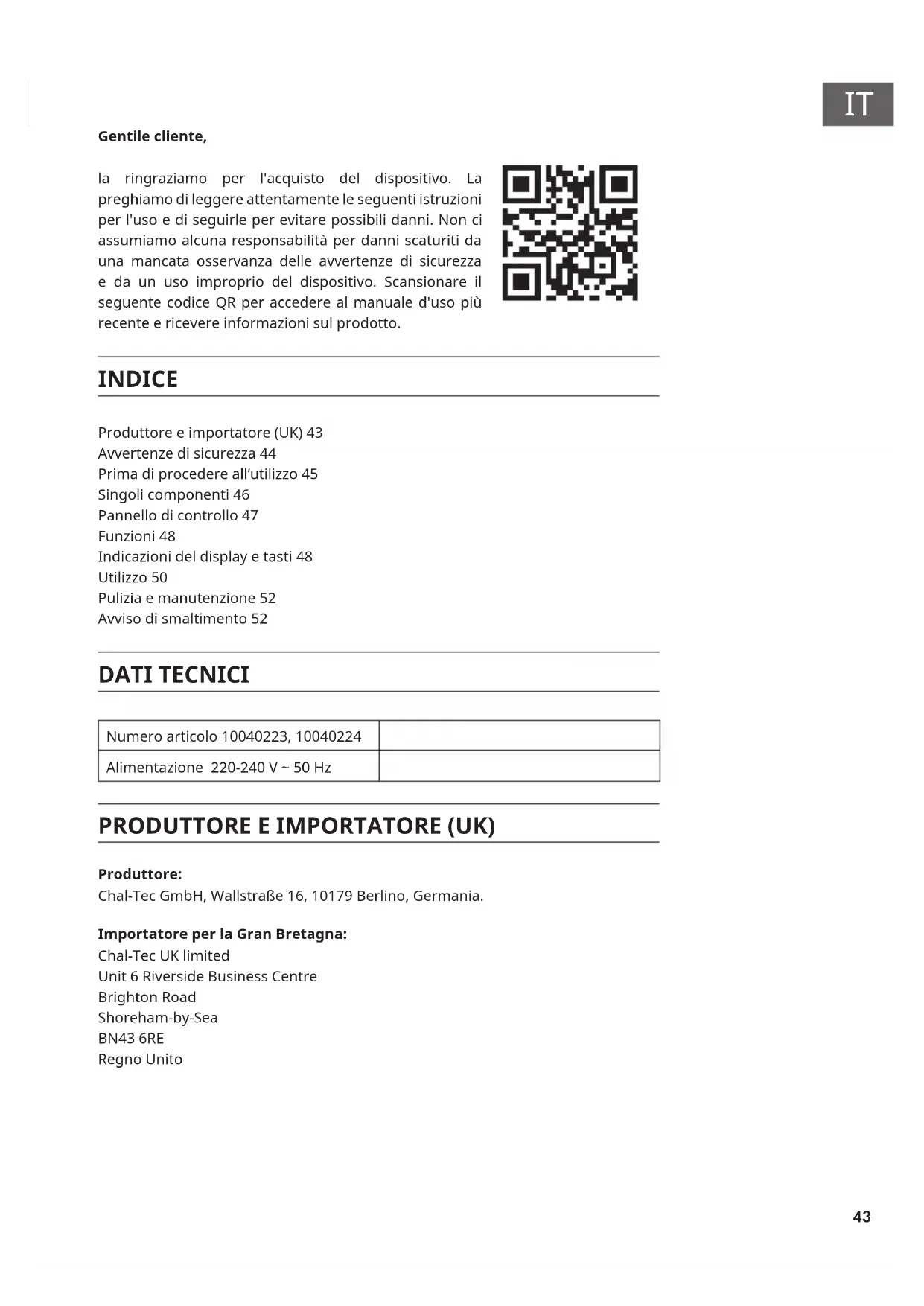 Gentile cliente, la ringraziamo per l'acquisto del dispositivo. La preghiamo di leggere attentamente le seguenti istruzioni per l'uso e di seguirle per evitare possibili danni. Non ci assumiamo alcuna responsabilità per danni scaturiti da una mancata osservanza delle avvertenze di sicurezza e da un uso improprio del dispositivo. Scansionare il seguente codice QR per accedere al manuale d'uso più recente e ricevere informazioni sul prodotto. INDICE Produttore e importatore (UK) 43 Avvertenze di sicurezza 44 Prima di procedere all‘utilizzo 45 Singoli componenti 46 Pannello di controllo 47 Funzioni 48 Indicazioni del display e tasti 48 Utilizzo 50 Pulizia e manutenzione 52 Avviso di smaltimento 52 DATI TECNICI Numero articolo 10040223, 10040224 Alimentazione 220-240 V ~ 50 Hz PRODUTTORE E IMPORTATORE (UK) Produttore: Chal-Tec GmbH, Wallstraße 16, 10179 Berlino, Germania. Importatore per la Gran Bretagna: Chal-Tec UK limited Unit 6 Riverside Business Centre Brighton Road Shoreham-by-Sea BN43 6RE Regno Unito44