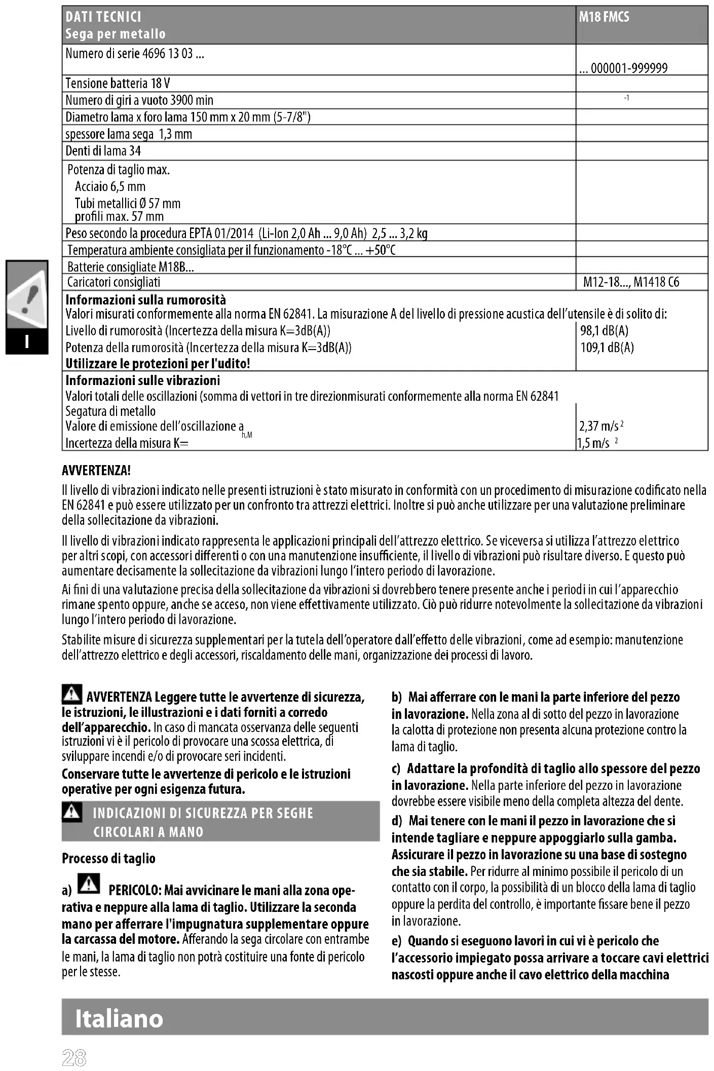 Diametro lama x foro lama 150 mm x 20 mm (5-7/8") spessore lama sega 1,3 mm Denti di lama 34 Potenza di taglio max. Acciaio 6,5 mm Tubi metallici Ø 57 mm proli max. 57 mm Peso secondo la procedura EPTA 01/2014 (Li-Ion 2,0 Ah ... 9,0 Ah) 2,5 ... 3,2 kg Temperatura ambiente consigliata per il funzionamento -18°C ... +50°C Batterie consigliate M18B... Caricatori consigliati M12-18..., M1418 C6 Informazioni sulla rumorosità Valori misurati conformemente alla norma EN 62841. La misurazione A del livello di pressione acustica dell’utensile è di solito di: Livello di rumorosità (Incertezza della misura K=3dB(A)) 98,1 dB(A) Potenza della rumorosità (Incertezza della misura K=3dB(A)) 109,1 dB(A) Utilizzare le protezioni per l'udito! Informazioni sulle vibrazioni Valori totali delle oscillazioni (somma di vettori in tre direzionmisurati conformemente alla norma EN 62841 Segatura di metallo Valore di emissione dell’oscillazione a h,M 2,37 m/s