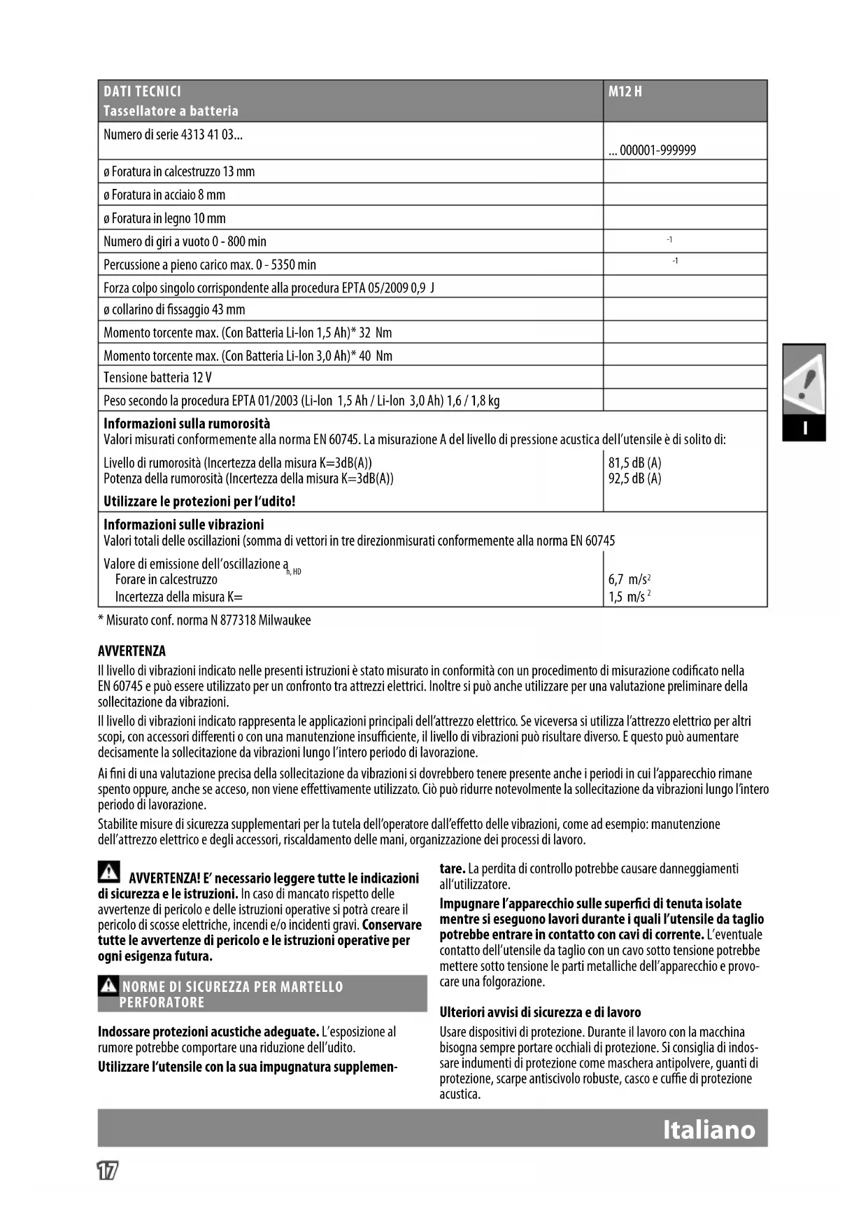 PERFORATORE Indossare protezioni acustiche adeguate. L’esposizione al rumore potrebbe comportare una riduzione dell’udito. Utilizzare l‘utensile con la sua impugnatura supplemen- tare. La perdita di controllo potrebbe causare danneggiamenti all‘utilizzatore. Impugnare l’apparecchio sulle superci di tenuta isolate mentre si eseguono lavori durante i quali l’utensile da taglio potrebbe entrare in contatto con cavi di corrente. L’eventuale contatto dell’utensile da taglio con un cavo sotto tensione potrebbe mettere sotto tensione le parti metalliche dell’apparecchio e provo- care una folgorazione. Ulteriori avvisi di sicurezza e di lavoro Usare dispositivi di protezione. Durante il lavoro con la macchina bisogna sempre portare occhiali di protezione. Si consiglia di indos- sare indumenti di protezione come maschera antipolvere, guanti di protezione, scarpe antiscivolo robuste, casco e cue di protezione acustica. DATI TECNICI Tassellatore a batteria M12 H Numero di serie 4313 41 03... ... 000001-999999 ø Foratura in calcestruzzo 13 mm ø Foratura in acciaio 8 mm ø Foratura in legno 10 mm Numero di giri a vuoto 0 - 800 min