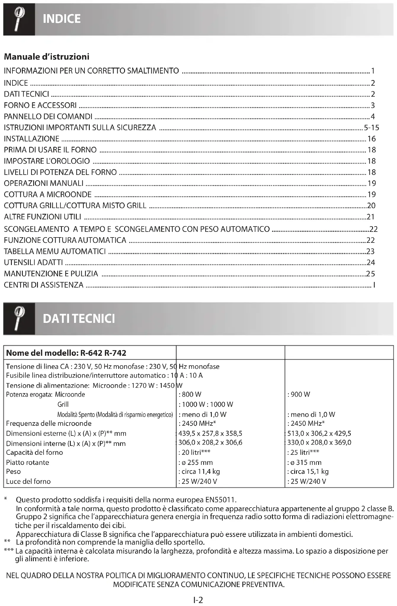 - Questo prodotto soddisfa i requisiti della norma europea EN55011. In conformità a tale norma, questo prodotto è classi cato come apparecchiatura appartenente al gruppo 2 classe B. Gruppo 2 signi ca che l’apparecchiatura genera energia in frequenza radio sotto forma di radiazioni elettromagne- tiche per il riscaldamento dei cibi. Apparecchiatura di Classe B signi ca che l’apparecchiatura può essere utilizzata in ambienti domestici. ** La profondità non comprende la maniglia dello sportello. *** La capacità interna è calcolata misurando la larghezza, profondità e altezza massima. Lo spazio a disposizione per gli alimenti è inferiore. NEL QUADRO DELLA NOSTRA POLITICA DI MIGLIORAMENTO CONTINUO, LE SPECIFICHE TECNICHE POSSONO ESSERE MODIFICATE SENZA COMUNICAZIONE PREVENTIVA. FUNZIONE COTTURA AUTOMATICA ........................................................................................................................................22 2I-3 ITALIANO