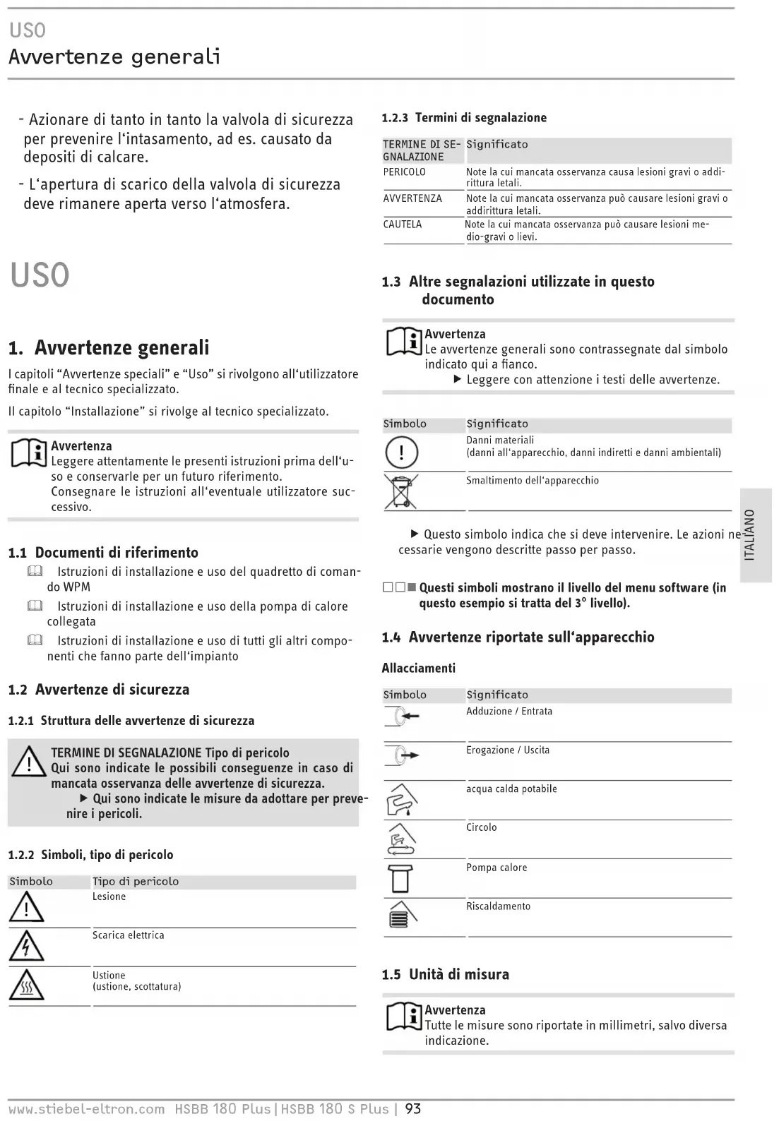 Avvertenze generali www.stiebel-eltron.com HSBB 180 Plus|HSBB 180 S Plus | 93ITALIANO - Azionare di tanto in tanto la valvola di sicurezza per prevenire l‘intasamento, ad es. causato da depositi di calcare. - L‘apertura di scarico della valvola di sicurezza deve rimanere aperta verso l‘atmosfera. USO