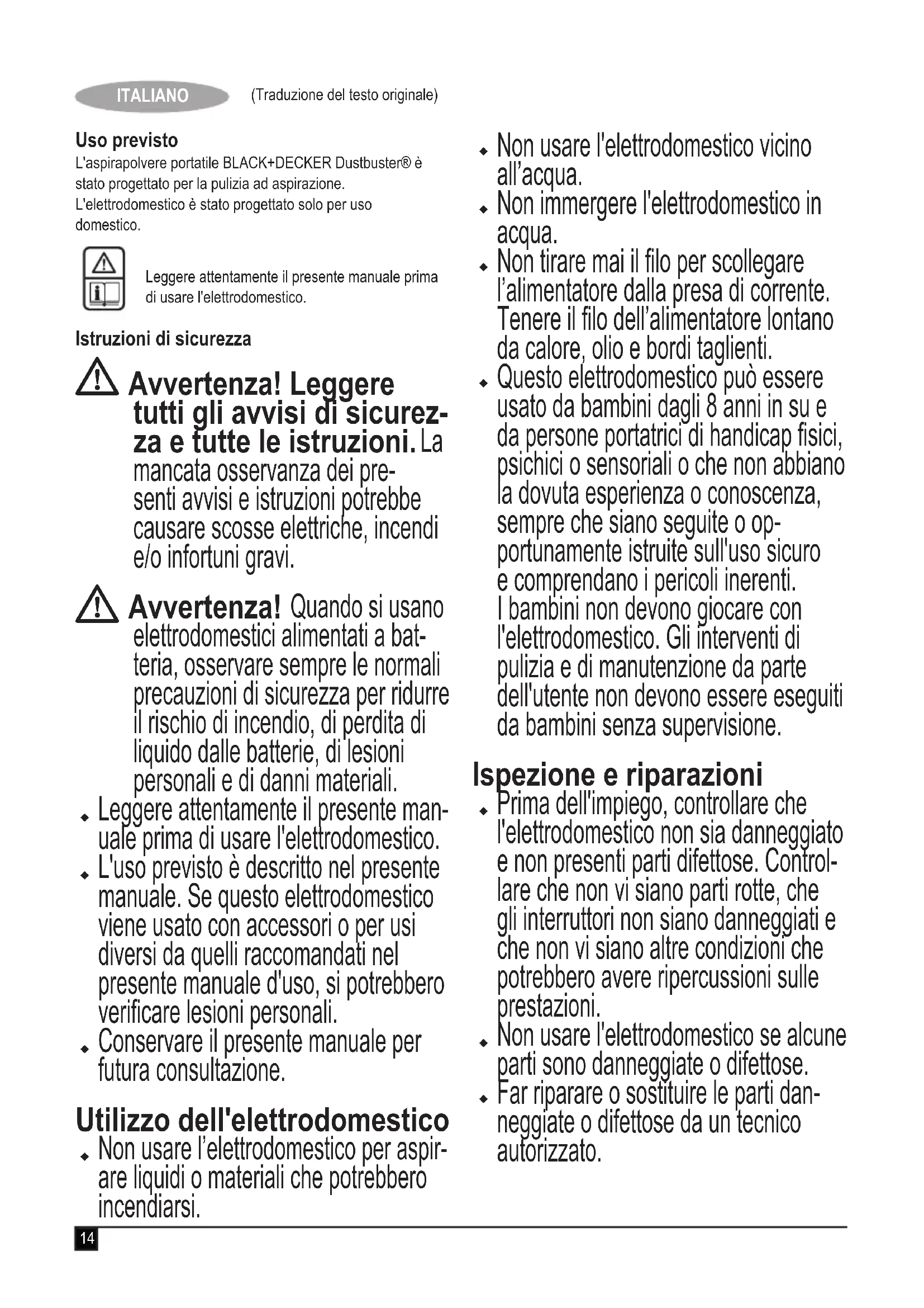 La base di carica può solo essere usata all'interno. Manutenzione Questo elettrodomestico BLACK+DECKER cordless è stato pro-gettato per funzionare a lungo con una manutenzione minima. Per ottenere prestazioni sempre soddisfacenti occorre avere cura dell'elettroutensile e sottoporlo a pulizia periodica. Attenzione! Prima di qualsiasi operazione di manutenzione su elettrodomestici cordless, effettuare quanto segue: u scaricare completamente la batteria se è di tipo integrale e quindi spegnerlo. u Scollegare l'alimentatore dalla presa di corrente prima di pulirlo. L'alimentatore non richiede nessuna manutenzione salvo una regolare pulitura. u Pulire regolarmente le prese di ventilazione dell'elettrodomestico/alimentatore con un pennello o con un panno morbido e asciutto. u Il vano del motore deve essere pulito regolarmente con un panno umido. Non usare materiali abrasivi o detergenti a base di solventi.17 (Traduzione del testo originale) ITALIANO Protezione dell’ambiente
