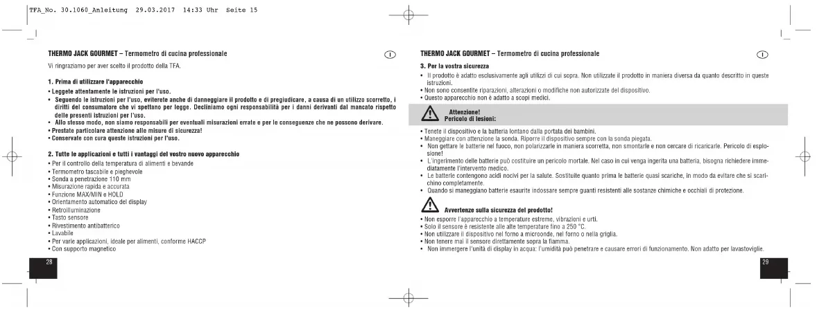 Scarica le istruzioni per il tuo Termometro in formato PDF gratuitamente! Trova il tuo manuale 30.1060.05 - TFA e riprendi in mano il tuo dispositivo elettronico. In questa pagina sono pubblicati tutti i documenti necessari per l'utilizzo del tuo dispositivo. 30.1060.05 del marchio TFA.