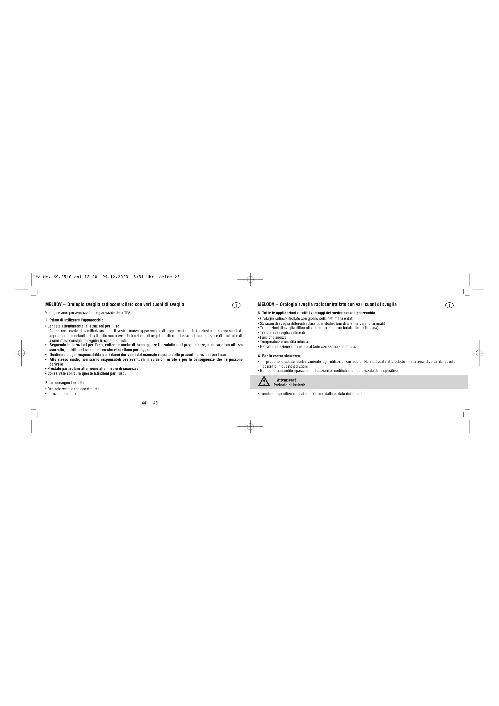 - Allo stesso modo, non siamo responsabili per eventuali misurazioni errate e per le conseguenze che ne possono derivare.• Prestate particolare attenzione alle misure di sicurezza!• Conservate con cura queste istruzioni per l'uso.2. La consegna include• Orologio sveglia radiocontrollato• Istruzioni per l'uso MELODY – Orologio sveglia radiocontrollato con vari suoni di sveglia