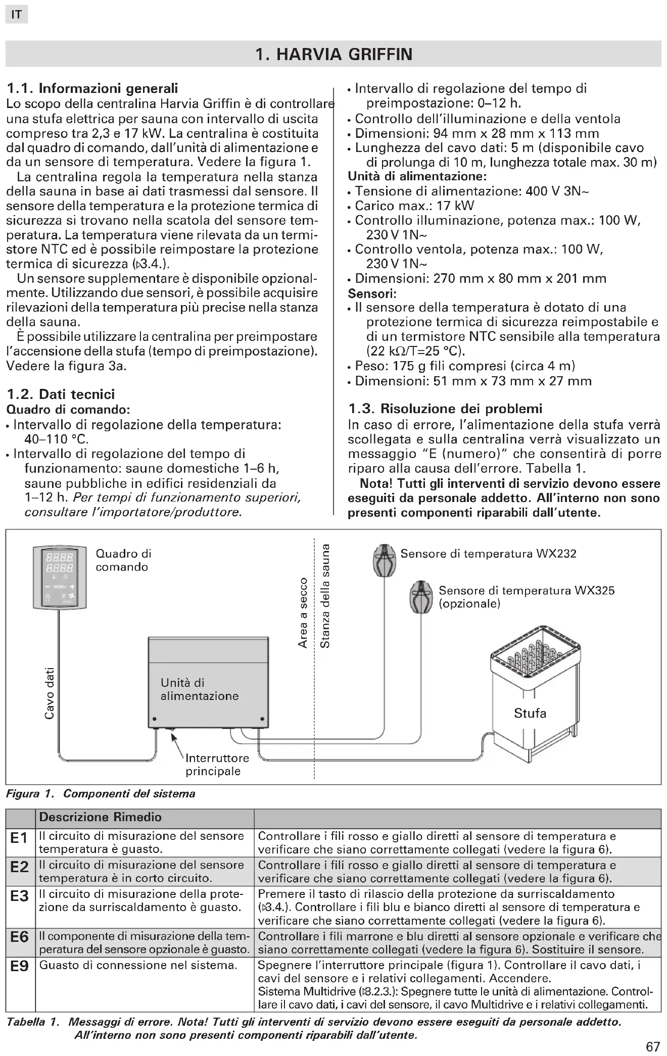 Figura 1. Componenti del sistema 1.1. Informazioni generali Lo scopo della centralina Harvia Grifn è di controllare una stufa elettrica per sauna con intervallo di uscita compreso tra 2,3 e 17 kW. La centralina è costituita dal quadro di comando, dall’unità di alimentazione e da un sensore di temperatura. Vedere la gura 1. La centralina regola la temperatura nella stanza della sauna in base ai dati trasmessi dal sensore. Il sensore della temperatura e la protezione termica di sicurezza si trovano nella scatola del sensore tem- peratura. La temperatura viene rilevata da un termi- store NTC ed è possibile reimpostare la protezione termica di sicurezza ( 3.4.). Un sensore supplementare è disponibile opzional- mente. Utilizzando due sensori, è possibile acquisire rilevazioni della temperatura più precise nella stanza della sauna. È possibile utilizzare la centralina per preimpostare l’accensione della stufa (tempo di preimpostazione). Vedere la gura 3a. 1.2. Dati tecnici Quadro di comando: