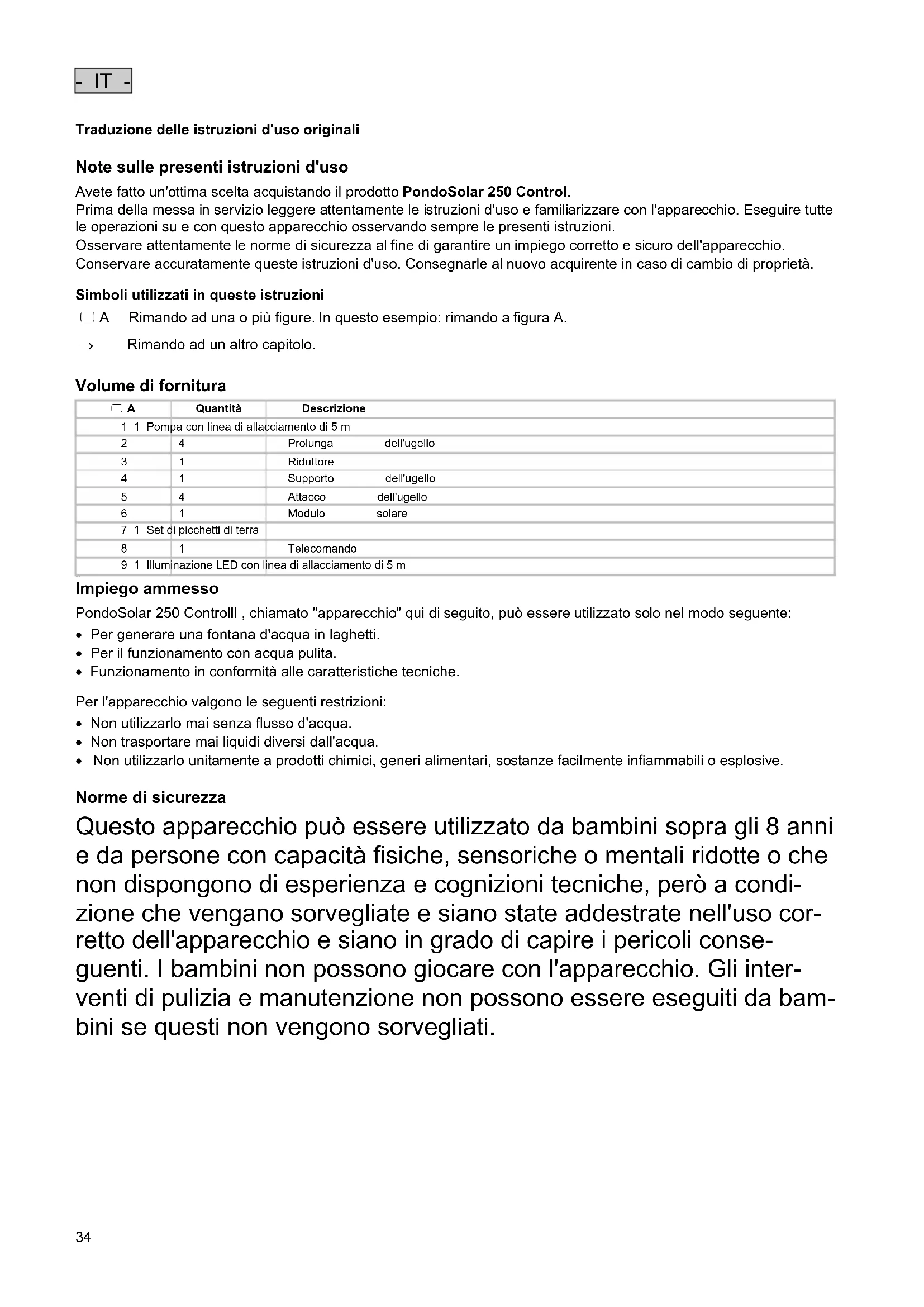 Note sulle presenti istruzioni d'uso Avete fatto un'ottima scelta acquistando il prodotto PondoSolar 250 Control. Prima della messa in servizio leggere attentamente le istruzioni d'uso e familiarizzare con l'apparecchio. Eseguire tutte le operazioni su e con questo apparecchio osservando sempre le presenti istruzioni. Osservare attentamente le norme di sicurezza al fine di garantire un impiego corretto e sicuro dell'apparecchio. Conservare accuratamente queste istruzioni d'uso. Consegnarle al nuovo acquirente in caso di cambio di proprietà.