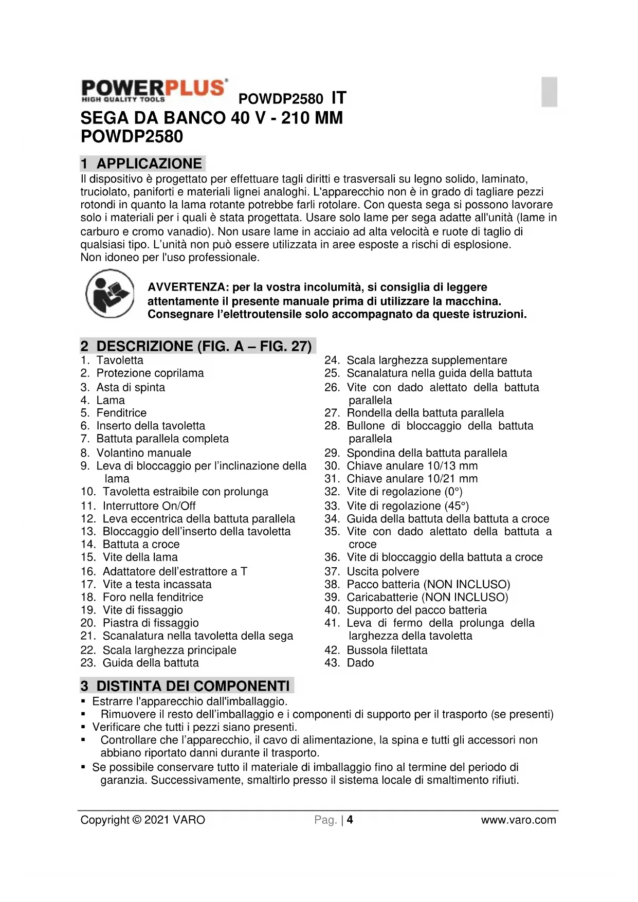 Con la presente, VARO N.V. – Vic. Van Rompuy N.V. Joseph Van Instraat 9 – B2500 Lier, Belgio, dichiara che Descrizione dell’apparecchio: SEGA DA BANCO – A batteria Marchio: PowerPlus Numero articolo: POWDP2580 è conforme ai requisiti essenziali e alle altre disposizioni pertinenti stabilite dalle Direttive Europee in base all’applicazione delle norme europee armonizzate. Qualsiasi modifica effettuata sul prodotto rende nulla questa dichiarazione. Direttive europee (inclusi eventuali emendamenti fino alla data della firma): 2011/65/EU 2014/30/CE 2006/42/CE Norme europee armonizzate (inclusi eventuali emendamenti fino alla data della firma): EN62841-1 : 2015 EN62841-3-1 : 2014 EN55014-1 : 2017 EN55014-2 : 2015 Depositario della documentazione tecnica: Philippe Vankerkhove, VARO – Vic. Van Rompuy N.V. Il sottoscritto agisce in nome e per conto del CEO della società, Ludo Mertens Regulatory Affairs – Compliance Manager 28/10/2021, Lier - BelgiumPOWDP2580 PT Copyright © 2021 VARO Página | 1 www.varo.com 1 APLICAÇÃO ..................................................................................... 4