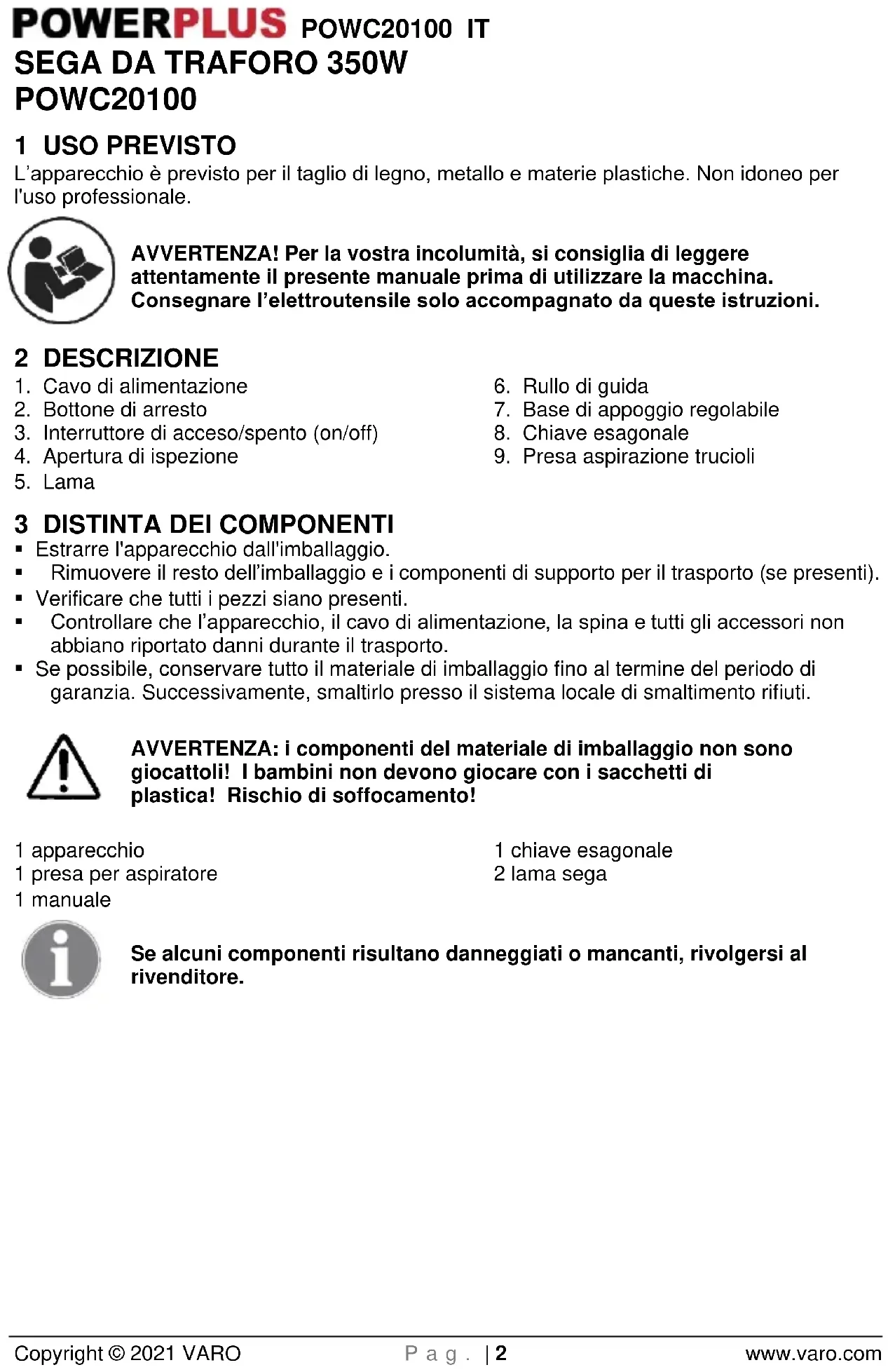 POWC20100 1 USO PREVISTO L’apparecchio è previsto per il taglio di legno, metallo e materie plastiche. Non idoneo per l'uso professionale. AVVERTENZA! Per la vostra incolumità, si consiglia di leggere attentamente il presente manuale prima di utilizzare la macchina. Consegnare l’elettroutensile solo accompagnato da queste istruzioni. 2 DESCRIZIONE