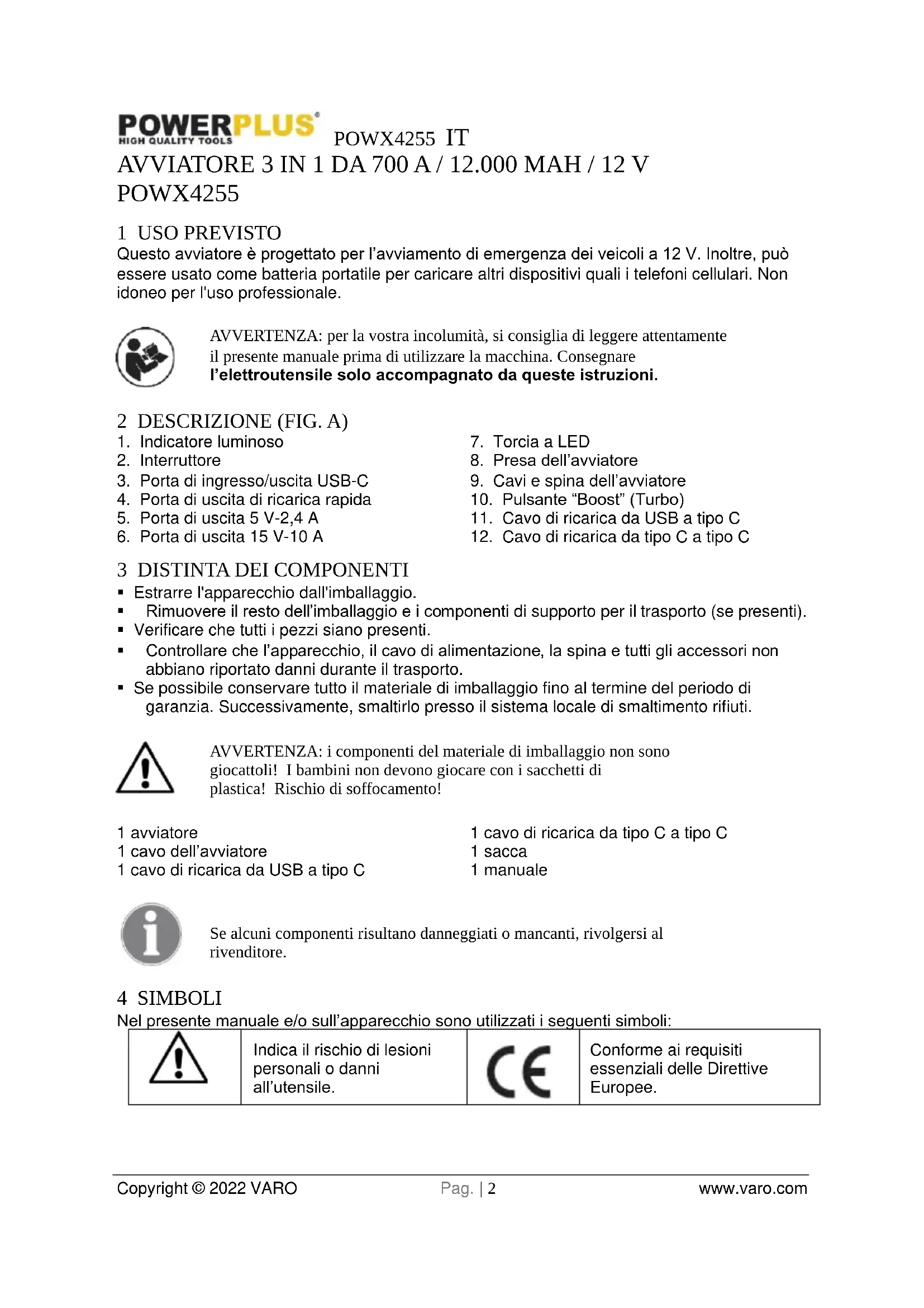Conforme ai requisiti essenziali delle Direttive Europee.POWX4255 IT Copyright © 2022 VARO Pag. | 3 www.varo.com
