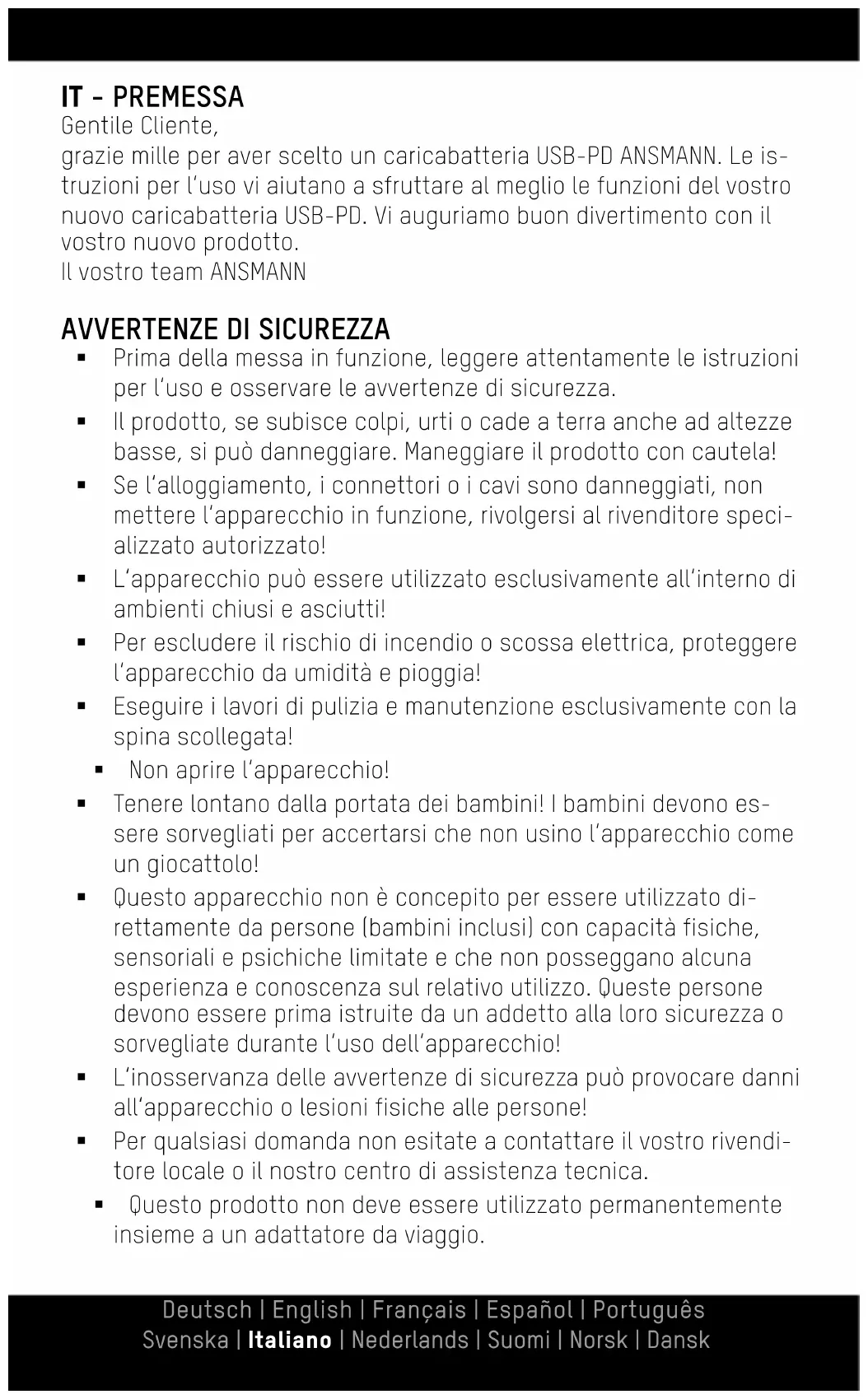 Prima della messa in funzione, leggere attentamente le istruzioni per l‘uso e osservare le avvertenze di sicurezza. Il prodotto, se subisce colpi, urti o cade a terra anche ad altezze basse, si può danneggiare. Maneggiare il prodotto con cautela! Se l‘alloggiamento, i connettori o i cavi sono danneggiati, non mettere l‘apparecchio in funzione, rivolgersi al rivenditore speci- alizzato autorizzato! L‘apparecchio può essere utilizzato esclusivamente all‘interno di ambienti chiusi e asciutti! Per escludere il rischio di incendio o scossa elettrica, proteggere l‘apparecchio da umidità e pioggia! Eseguire i lavori di pulizia e manutenzione esclusivamente con la spina scollegata! Non aprire l‘apparecchio! Tenere lontano dalla portata dei bambini! I bambini devono es- sere sorvegliati per accertarsi che non usino l‘apparecchio come un giocattolo! Questo apparecchio non è concepito per essere utilizzato di- rettamente da persone (bambini inclusi) con capacità fisiche, sensoriali e psichiche limitate e che non posseggano alcuna esperienza e conoscenza sul relativo utilizzo. Queste persone devono essere prima istruite da un addetto alla loro sicurezza o sorvegliate durante l‘uso dell‘apparecchio! L‘inosservanza delle avvertenze di sicurezza può provocare danni all‘apparecchio o lesioni fisiche alle persone! Per qualsiasi domanda non esitate a contattare il vostro rivendi- tore locale o il nostro centro di assistenza tecnica. Questo prodotto non deve essere utilizzato permanentemente insieme a un adattatore da viaggio. Deutsch | English | Français | Español | Português Svenska | Italiano | Nederlands | Suomi | Norsk | DanskMESSA IN FUNZIONE Compatibile con PD Compatibile con PD Compatibile con USB tipo C PD Ricarica rapida Elevata potenza