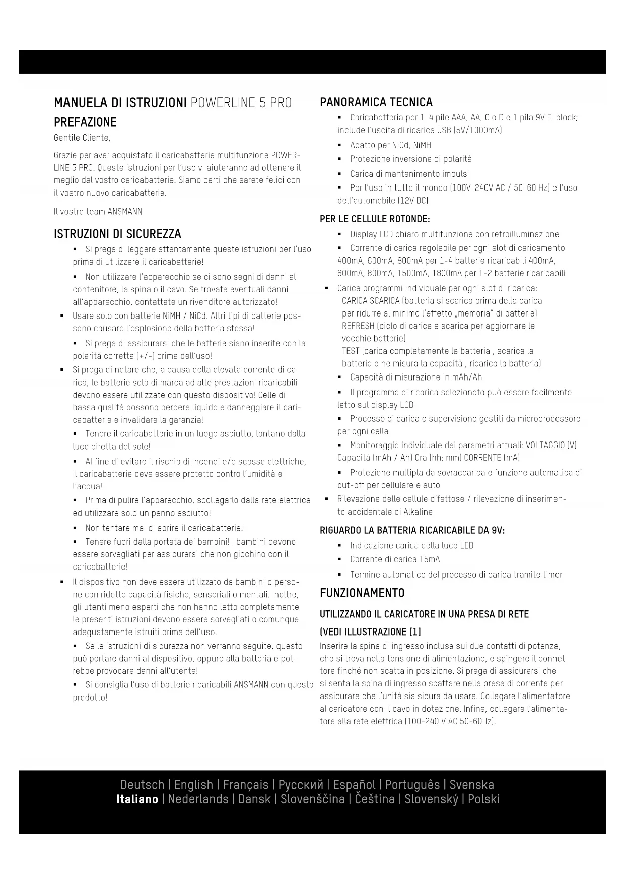 Si prega di leggere attentamente queste istruzioni per l‘uso prima di utilizzare il caricabatterie! Non utilizzare l‘apparecchio se ci sono segni di danni al contenitore, la spina o il cavo. Se trovate eventuali danni all‘apparecchio, contattate un rivenditore autorizzato! Usare solo con batterie NiMH / NiCd. Altri tipi di batterie pos- sono causare l‘esplosione della batteria stessa! Si prega di assicurarsi che le batterie siano inserite con la polarità corretta (+/-) prima dell‘uso! Si prega di notare che, a causa della elevata corrente di ca- rica, le batterie solo di marca ad alte prestazioni ricaricabili devono essere utilizzate con questo dispositivo! Celle di bassa qualità possono perdere liquido e danneggiare il cari- cabatterie e invalidare la garanzia! Tenere il caricabatterie in un luogo asciutto, lontano dalla luce diretta del sole! Al fine di evitare il rischio di incendi e/o scosse elettriche, il caricabatterie deve essere protetto contro l‘umidità e l‘acqua! Prima di pulire l‘apparecchio, scollegarlo dalla rete elettrica ed utilizzare solo un panno asciutto! Non tentare mai di aprire il caricabatterie! Tenere fuori dalla portata dei bambini! I bambini devono essere sorvegliati per assicurarsi che non giochino con il caricabatterie! Il dispositivo non deve essere utilizzato da bambini o perso- ne con ridotte capacità fisiche, sensoriali o mentali. Inoltre, gli utenti meno esperti che non hanno letto completamente le presenti istruzioni devono essere sorvegliati o comunque adeguatamente istruiti prima dell‘uso! Se le istruzioni di sicurezza non verranno seguite, questo può portare danni al dispositivo, oppure alla batteria e pot- rebbe provocare danni all‘utente! Si consiglia l‘uso di batterie ricaricabili ANSMANN con questo prodotto! PANORAMICA TECNICA Caricabatteria per 1-4 pile AAA, AA, C o D e 1 pila 9V E-block; include l‘uscita di ricarica USB (5V/1000mA) Adatto per NiCd, NiMH Protezione inversione di polarità Carica di mantenimento impulsi Per l‘uso in tutto il mondo (100V-240V AC / 50-60 Hz) e l‘uso dell‘automobile (12V DC) PER LE CELLULE ROTONDE: Display LCD chiaro multifunzione con retroilluminazione Corrente di carica regolabile per ogni slot di caricamento 400mA, 600mA, 800mA per 1-4 batterie ricaricabili 400mA, 600mA, 800mA, 1500mA, 1800mA per 1-2 batterie ricaricabili Carica programmi individuale per ogni slot di ricarica: CARICA SCARICA (batteria si scarica prima della carica per ridurre al minimo l‘effetto „memoria“ di batterie) REFRESH (ciclo di carica e scarica per aggiornare le vecchie batterie) TEST (carica completamente la batteria , scarica la batteria e ne misura la capacità , ricarica la batteria) Capacità di misurazione in mAh/Ah Il programma di ricarica selezionato può essere facilmente letto sul display LCD Processo di carica e supervisione gestiti da microprocessore per ogni cella Monitoraggio individuale dei parametri attuali: VOLTAGGIO (V) Capacità (mAh / Ah) Ora (hh: mm) CORRENTE (mA) Protezione multipla da sovraccarica e funzione automatica di cut-off per cellulare e auto Rilevazione delle cellule difettose / rilevazione di inserimen- to accidentale di Alkaline RIGUARDO LA BATTERIA RICARICABILE DA 9V: Indicazione carica della luce LED Corrente di carica 15mA Termine automatico del processo di carica tramite timer FUNZIONAMENTO UTILIZZANDO IL CARICATORE IN UNA PRESA DI RETE (VEDI ILLUSTRAZIONE [1] Inserire la spina di ingresso inclusa sui due contatti di potenza, che si trova nella tensione di alimentazione, e spingere il connet- tore finché non scatta in posizione. Si prega di assicurarsi che si senta la spina di ingresso scattare nella presa di corrente per assicurare che l’unità sia sicura da usare. Collegare l‘alimentatore al caricatore con il cavo in dotazione. Infine, collegare l‘alimenta- tore alla rete elettrica (100-240 V AC 50-60Hz). Deutsch | English | Français | Pусский | Español | Português | Svenska Italiano | Nederlands | Dansk | Slovenščina | Čeština | Slovenský | PolskiPer cambiare la spina di ingresso, spingere la linguetta di bloc- caggio sotto la spina (ad esempio, utilizzando una penna) fino a quando questa possa essere spostata leggermente verso l‘alto. Quindi rimuoverla.