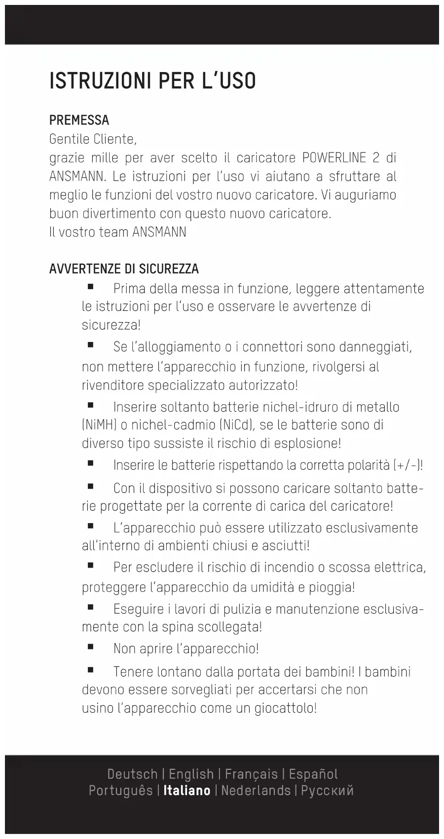 Prima della messa in funzione, leggere attentamente le istruzioni per l‘uso e osservare le avvertenze di sicurezza! Se l’alloggiamento o i connettori sono danneggiati, non mettere l‘apparecchio in funzione, rivolgersi al rivenditore specializzato autorizzato! Inserire soltanto batterie nichel-idruro di metallo (NiMH) o nichel-cadmio (NiCd), se le batterie sono di diverso tipo sussiste il rischio di esplosione! Inserire le batterie rispettando la corretta polarità (+/-)! Con il dispositivo si possono caricare soltanto batte- rie progettate per la corrente di carica del caricatore! L‘apparecchio può essere utilizzato esclusivamente all‘interno di ambienti chiusi e asciutti! Per escludere il rischio di incendio o scossa elettrica, proteggere l‘apparecchio da umidità e pioggia! Eseguire i lavori di pulizia e manutenzione esclusiva- mente con la spina scollegata! Non aprire l‘apparecchio! Tenere lontano dalla portata dei bambini! I bambini devono essere sorvegliati per accertarsi che non usino l‘apparecchio come un giocattolo! Deutsch | English | Français | Español Português | Italiano | Nederlands | Pусский Questo apparecchio non è concepito per essere uti- lizzato direttamente da persone (bambini inclusi) con capacità fisiche, sensoriali e psichiche limitate e che non posseggano alcuna esperienza e conoscenza sul relativo utilizzo. Queste persone devono essere prima istruite da un addetto alla loro sicurezza o sorvegliate durante l‘uso dell‘apparecchio! L‘inosservanza delle avvertenze di sicurezza può pro- vocare danni all‘apparecchio, alle batterie o lesioni fisiche alle persone! Si consiglia di utilizzare le batterie ANSMANN!