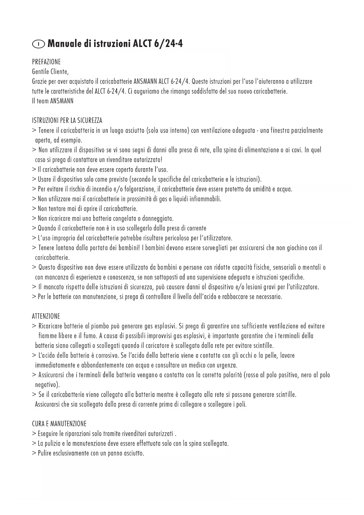> Tenere il caricabatteria in un luogo asciutto (solo uso interno) con ventilazione adeguata - una finestra parzialmente aperta, ad esempio. > Non utilizzare il dispositivo se vi sono segni di danni alla presa di rete, alla spina di alimentazione o ai cavi. In quel caso si prega di contattare un rivenditore autorizzato! > Il caricabatterie non deve essere coperto durante l‘uso. > Usare il dispositivo solo come previsto (secondo le specifiche del caricabatterie e le istruzioni). > Per evitare il rischio di incendio e/o folgorazione, il caricabatterie deve essere protetto da umidità e acqua. > Non utilizzare mai il caricabatterie in prossimità di gas o liquidi infiammabili. > Non tentare mai di aprire il caricabatterie. > Non ricaricare mai una batteria congelata o danneggiata. > Quando il caricabatterie non è in uso scollegarlo dalla presa di corrente > L‘uso improprio del caricabatterie potrebbe risultare pericoloso per l‘utilizzatore. > Tenere lontano dalla portata dei bambini! I bambini devono essere sorvegliati per assicurarsi che non giochino con il caricabatterie. > Questo dispositivo non deve essere utilizzato da bambini o persone con ridotte capacità fisiche, sensoriali o mentali o con mancanza di esperienza e conoscenza, se non sottoposti ad una supervisione adeguata e istruzioni specifiche. > Il mancato rispetto delle istruzioni di sicurezza, può causare danni al dispositivo e/o lesioni gravi per l‘utilizzatore. > Per le batterie con manutenzione, si prega di controllare il livello dell‘acido e rabboccare se necessario. ATTENZIONE > Ricaricare batterie al piombo può generare gas esplosivi. Si prega di garantire una sufficiente ventilazione ed evitare fiamme libere e il fumo. A causa di possibili improvvisi gas esplosivi, è importante garantire che i terminali della batteria siano collegati o scollegati quando il caricatore è scollegato dalla rete per evitare scintille. > L‘acido della batteria è corrosivo. Se l‘acido della batteria viene a contatto con gli occhi o la pelle, lavare immediatamente e abbondantemente con acqua e consultare un medico con urgenza. > Assicurarsi che i terminali della batteria vengano a contatto con la corretta polarità (rosso al polo positivo, nero al polo negativo). > Se il caricabatterie viene collegato alla batteria mentre è collegato alla rete si possono generare scintille. Assicurarsi che sia scollegato dalla presa di corrente prima di collegare o scollegare i poli.